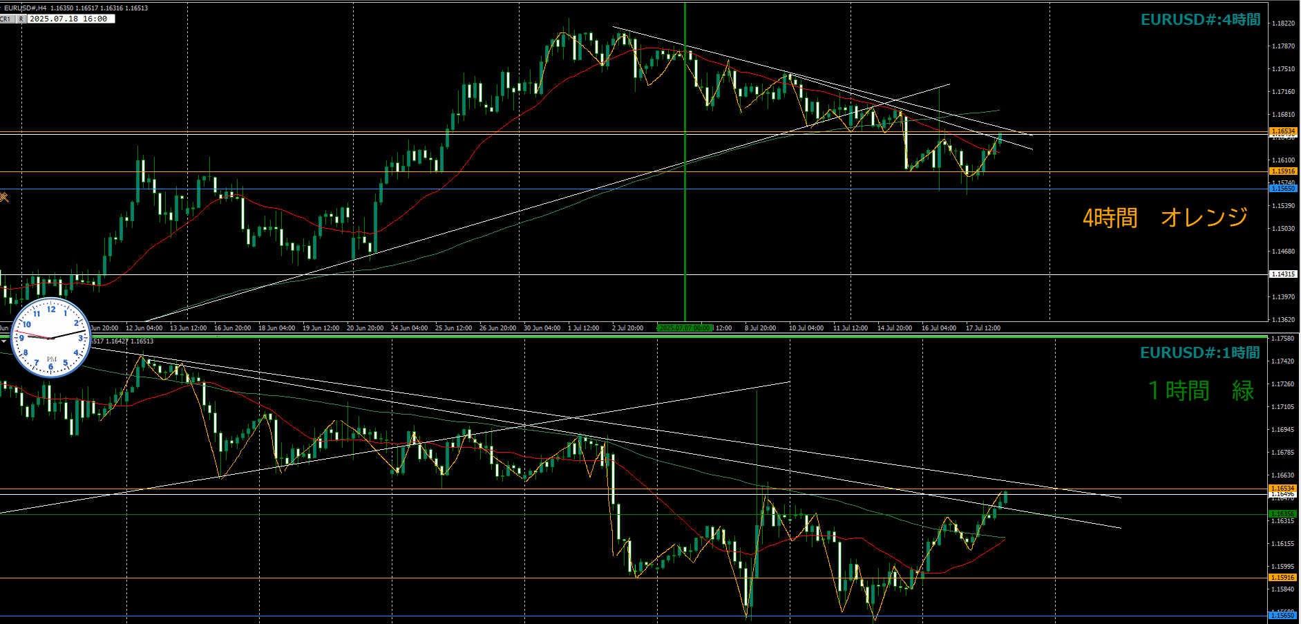 4時間では攻防ラインが2本視えているが、それを超えてくれば買い目線になってくる