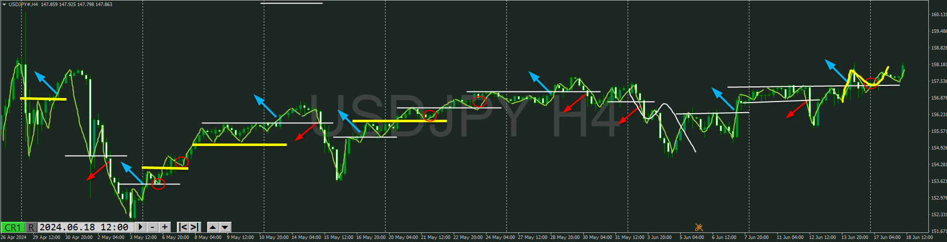 実線 前回高値のヒゲを折ってMAで支えられて居るヒゲをを参照