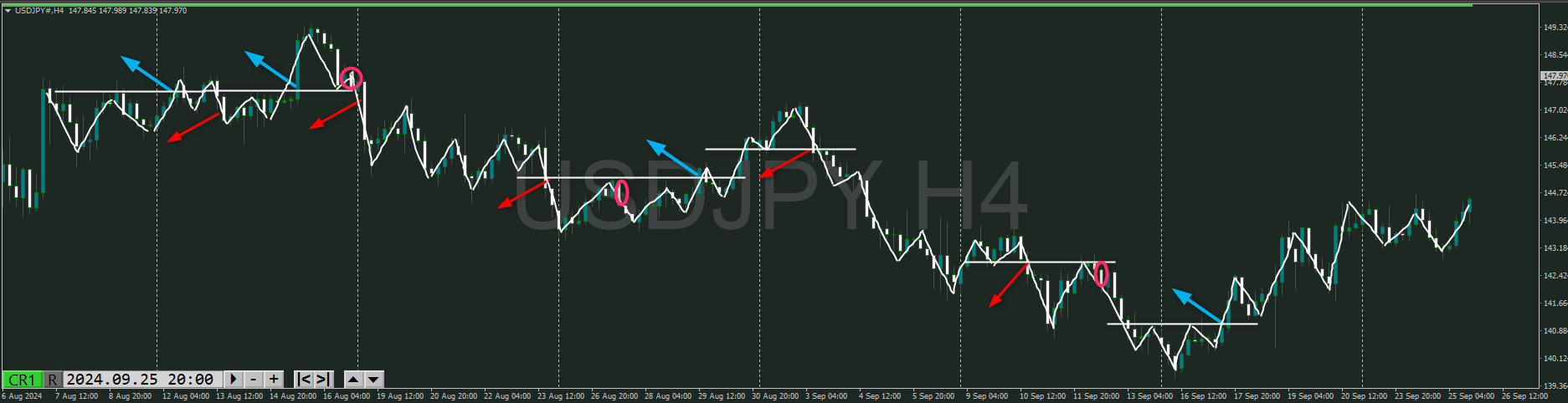 破線 調整から切り下げた安値と直近高値が一致しているところを参照