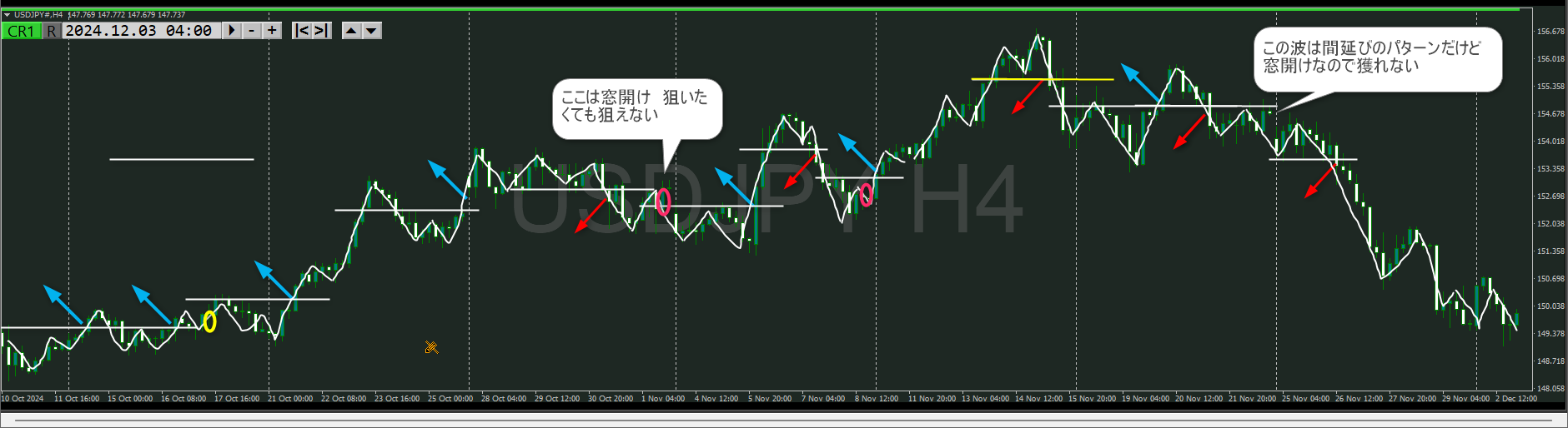 このパターンはMAがトレンド転換シグナルと重なっているので調整からの再度トレンド発生を待つしかないが、そこまで待つと買っている人の損切を巻き込めないので、嫌だな~と思う