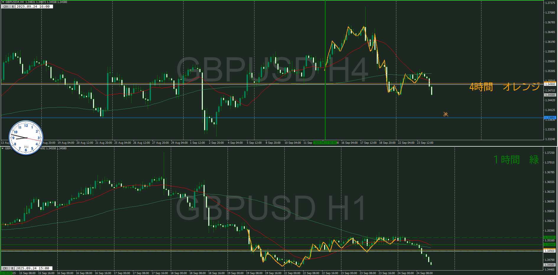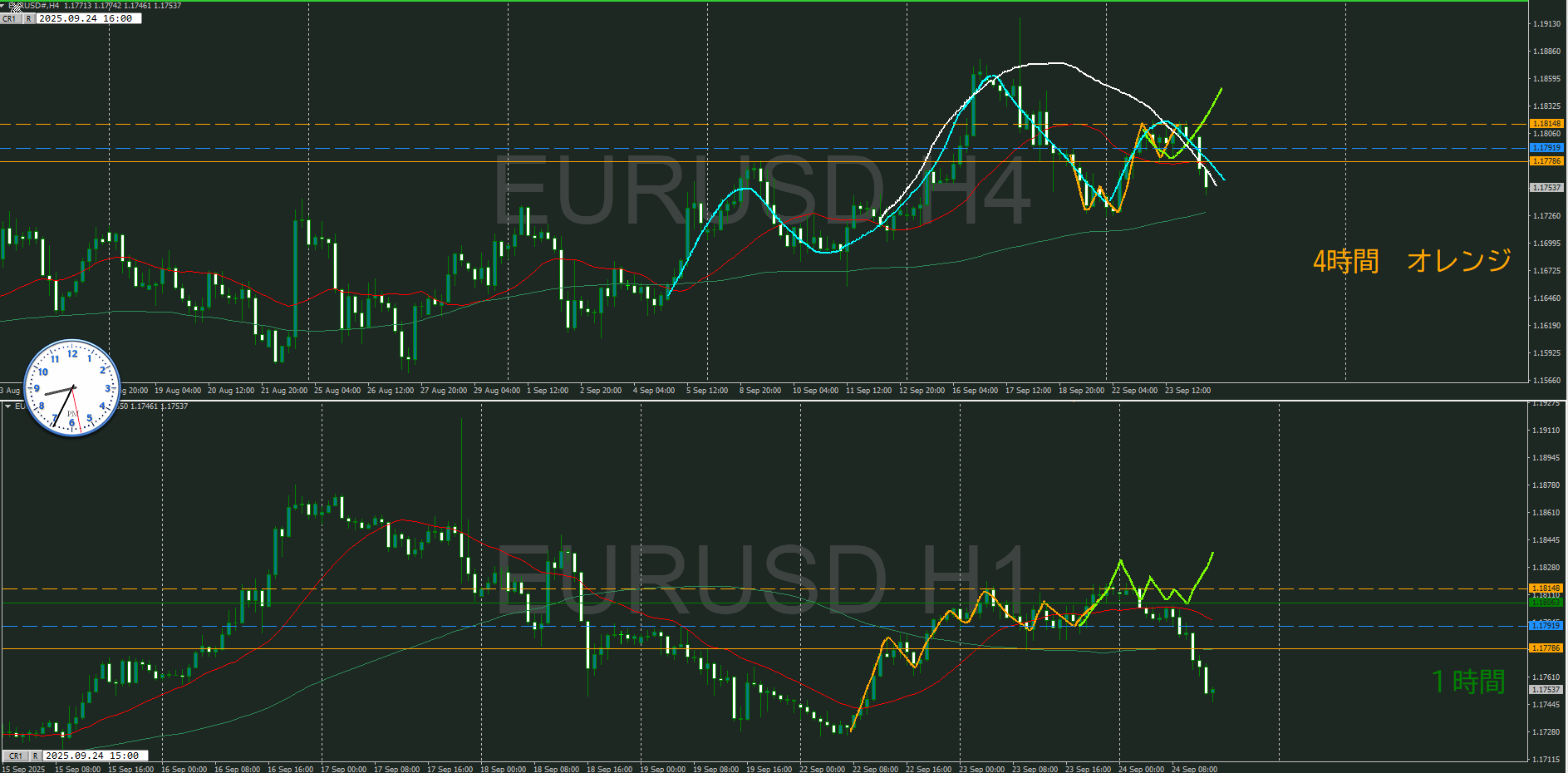 1時間で緑のカウントでは1時間の下落トレンドが確定するポイントがあったが、日足が気になっていたので入れなかった