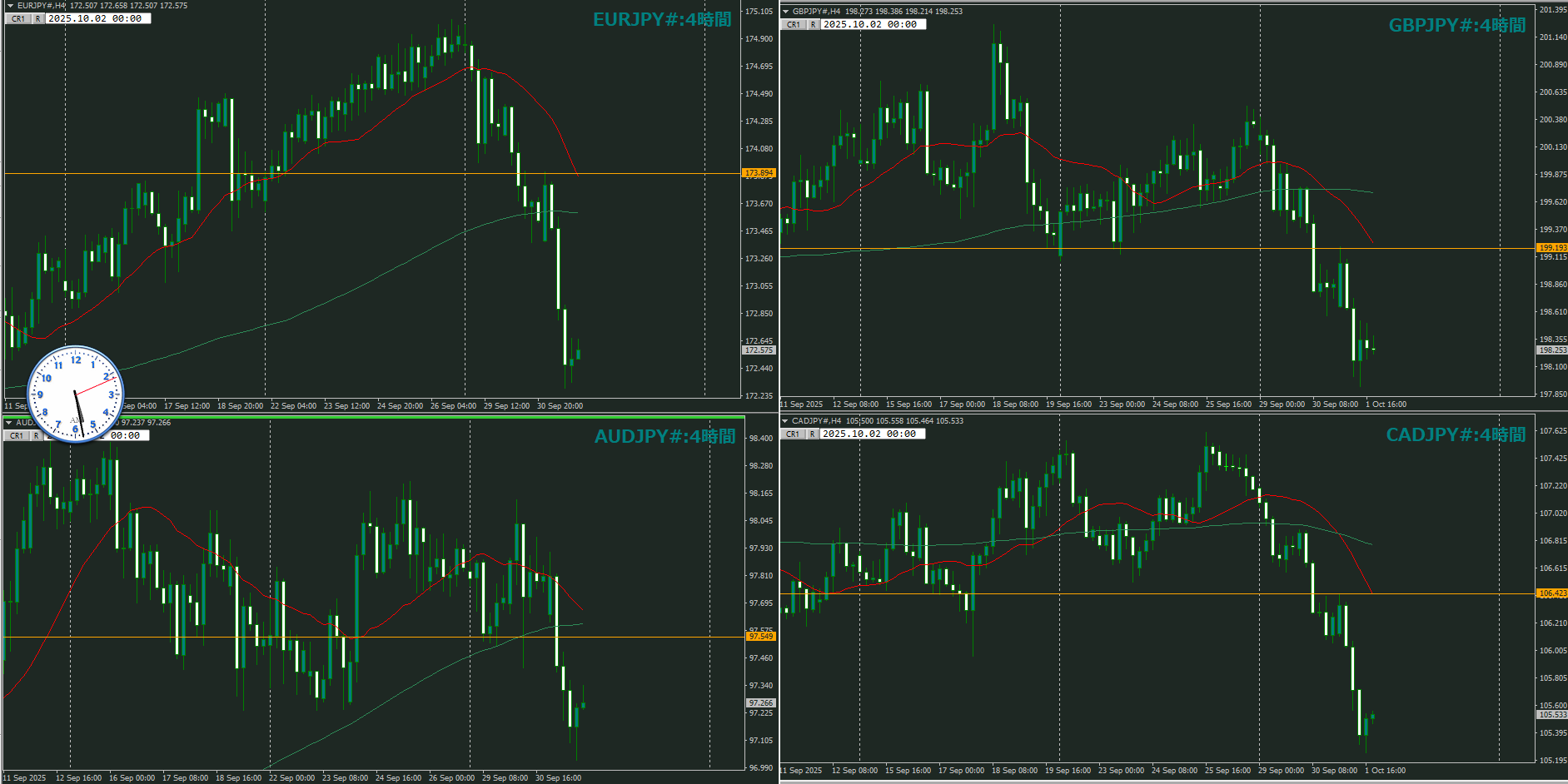 ドル円も動いたが、4時間のMAが追いつかないぐらい早く動いているので、狙う気もなかった