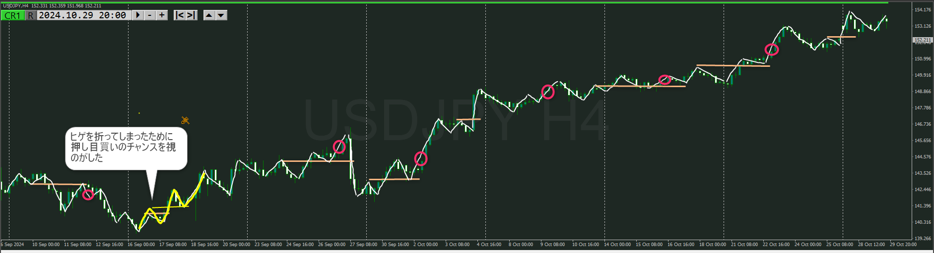 一か所、高値のヒゲを折ってしまい押し目買いのチャンスを見逃していた