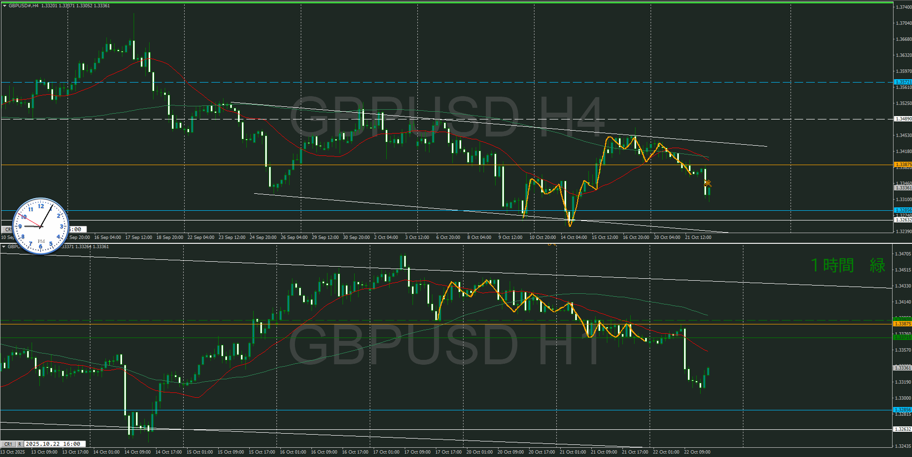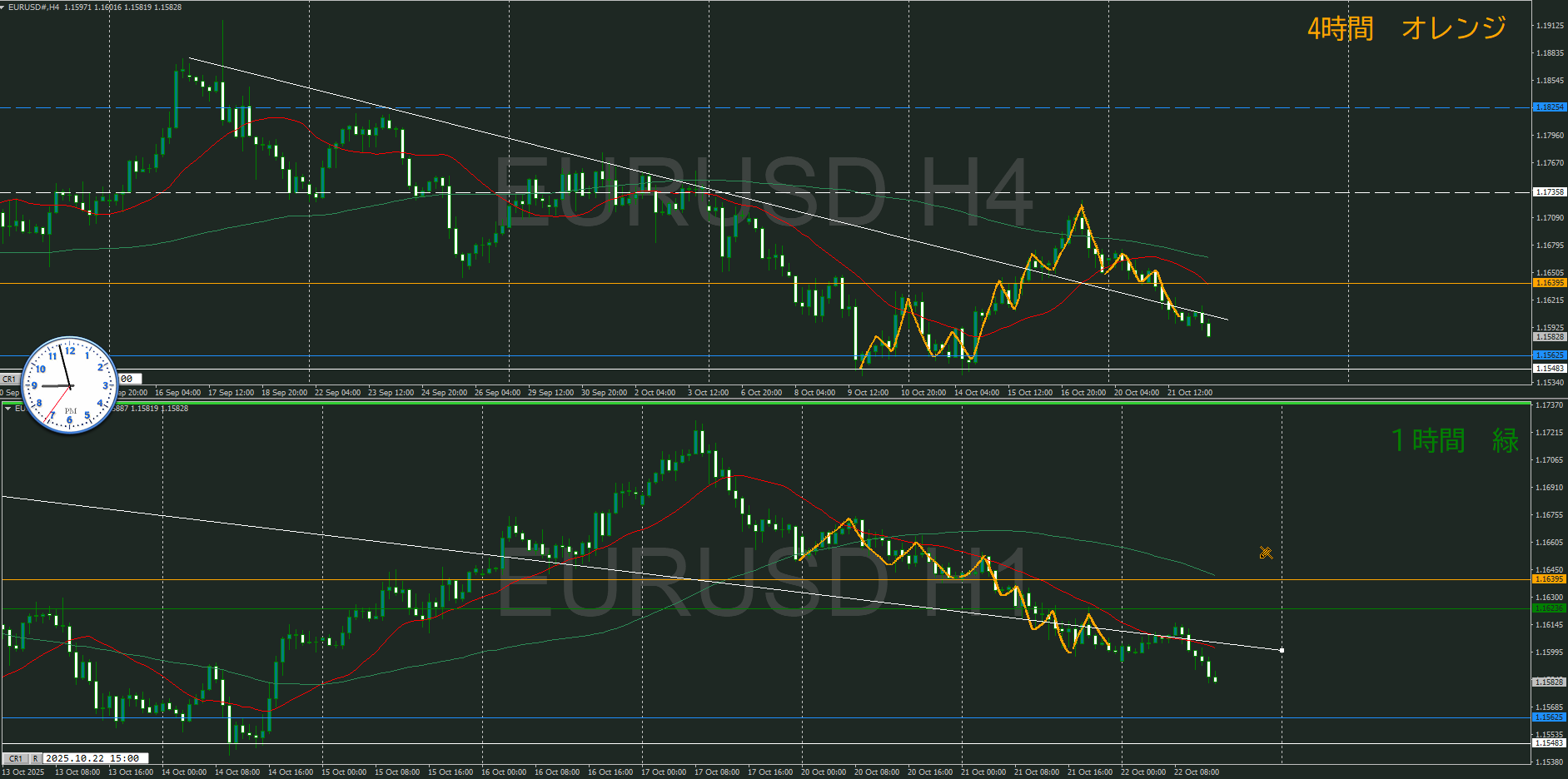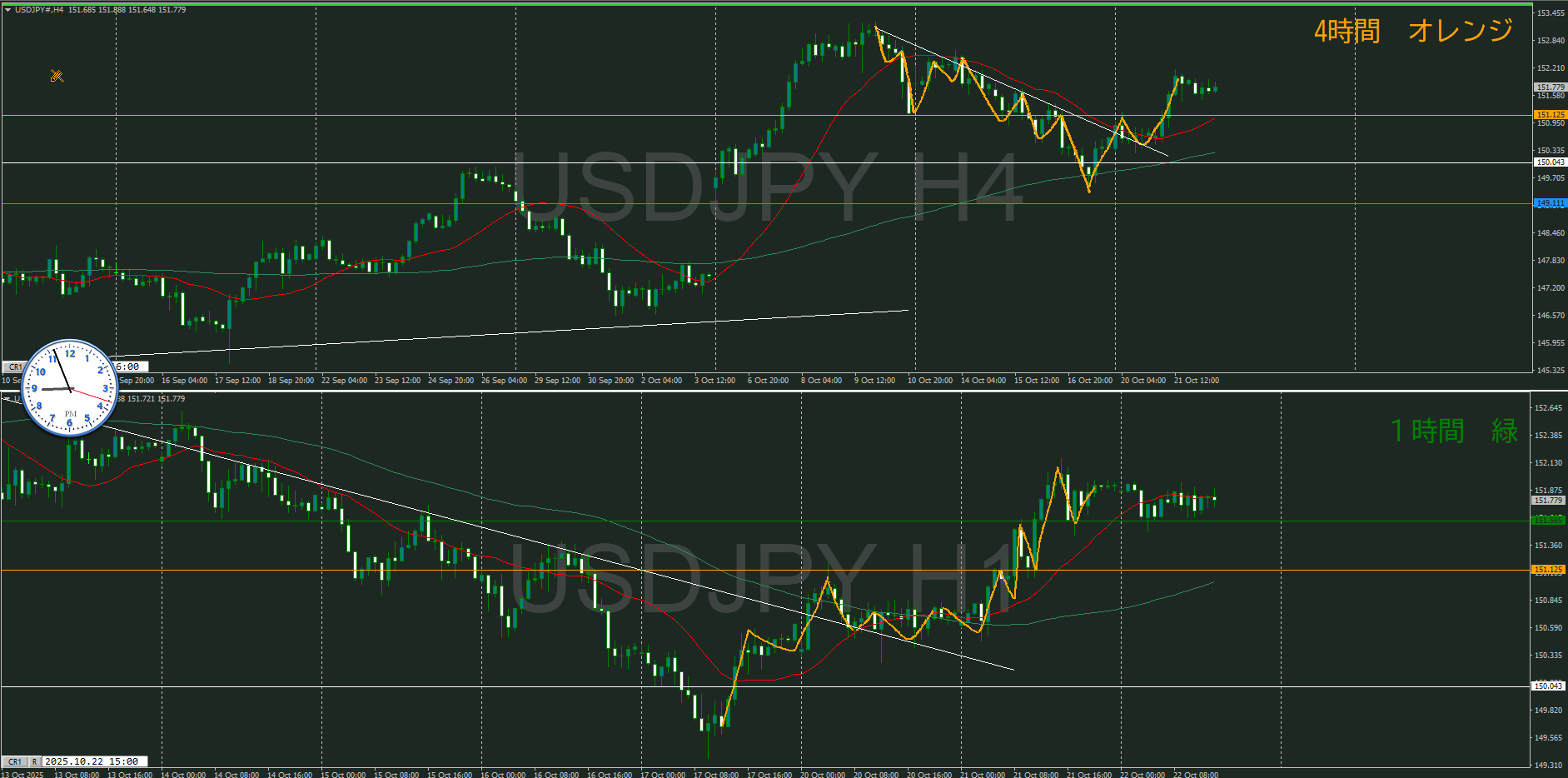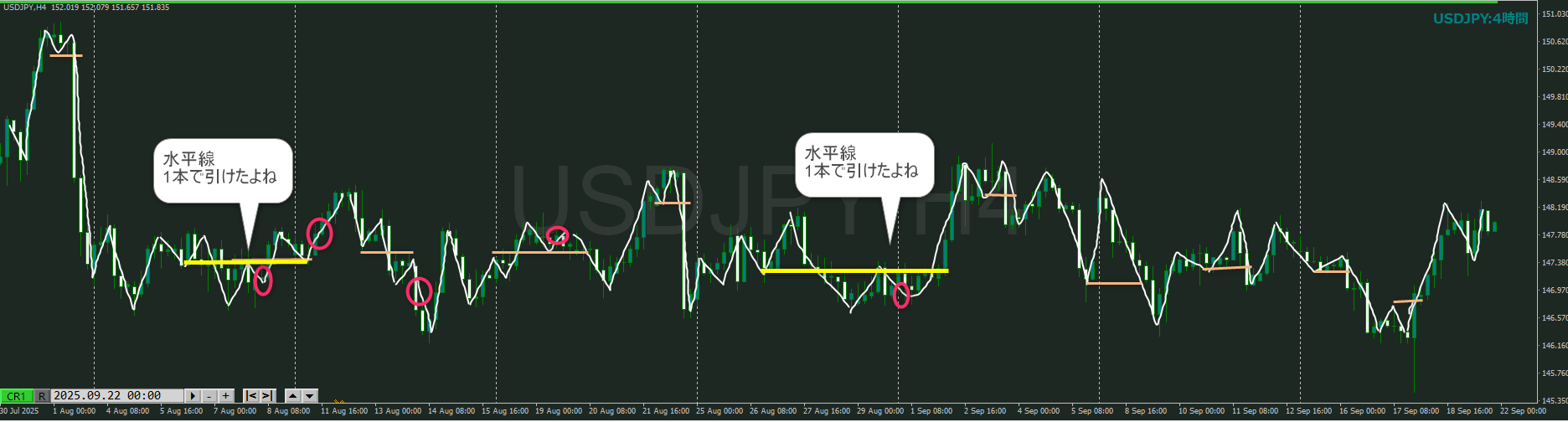 4時間が止まるのか、まだわからないがオレンジの水平線が押し目買い勢力が現れ易い候補