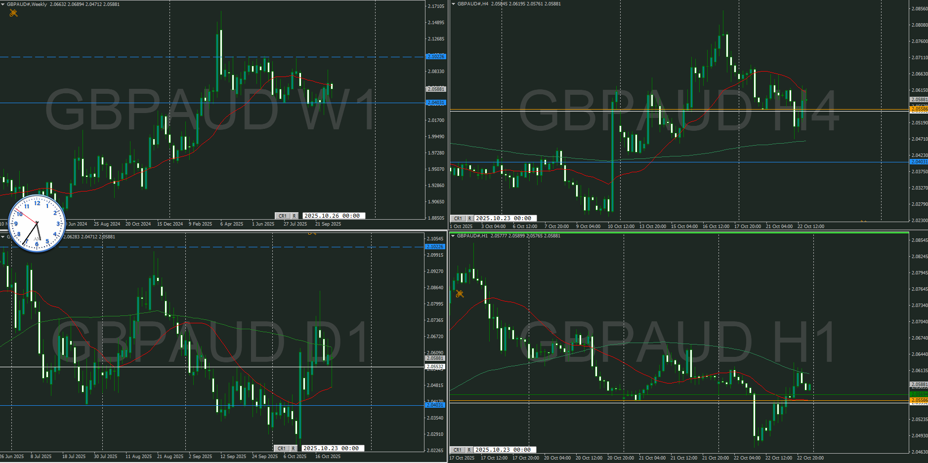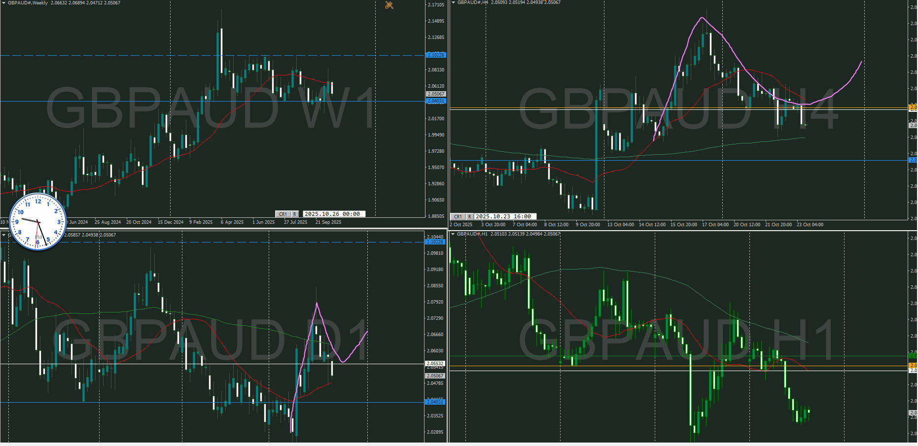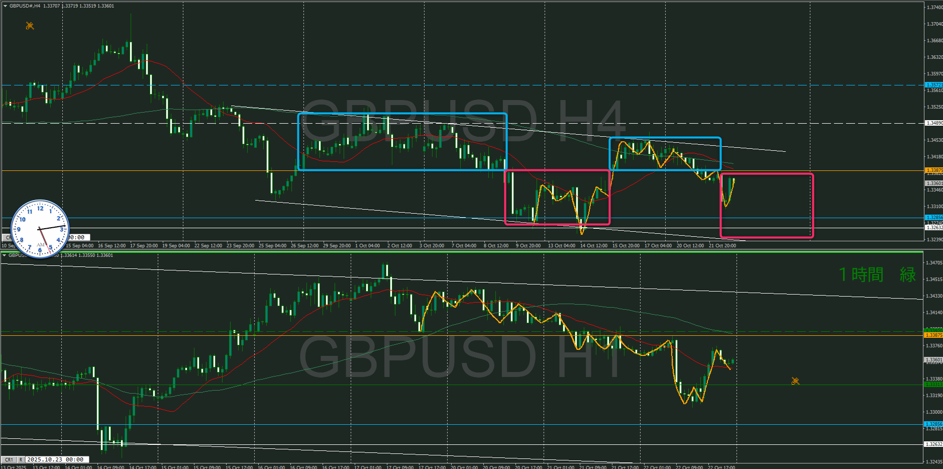 4時間を改めて見直すと、買いと売りのエリアに分かれていて、今は売りのエリア