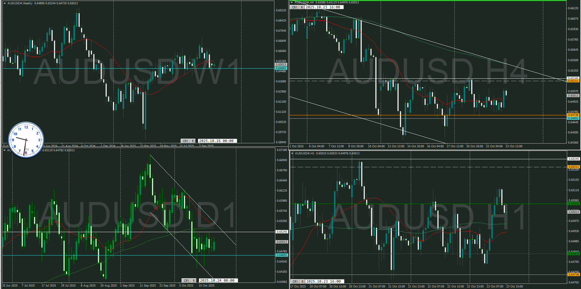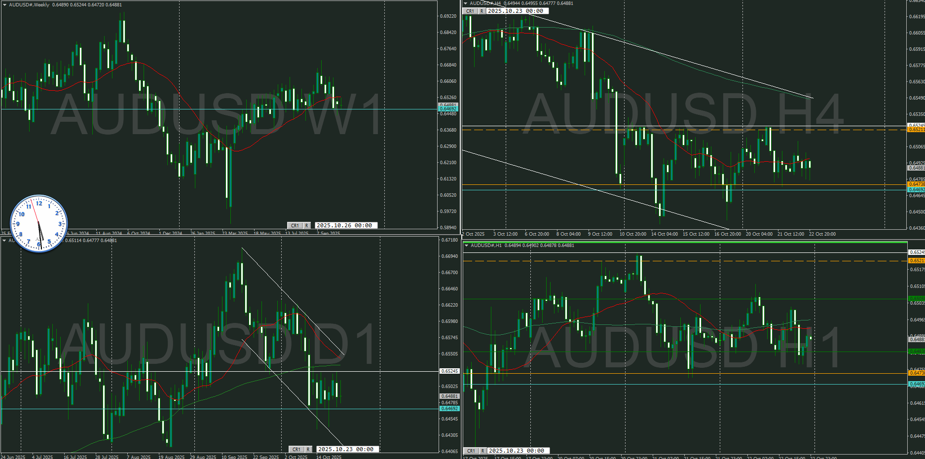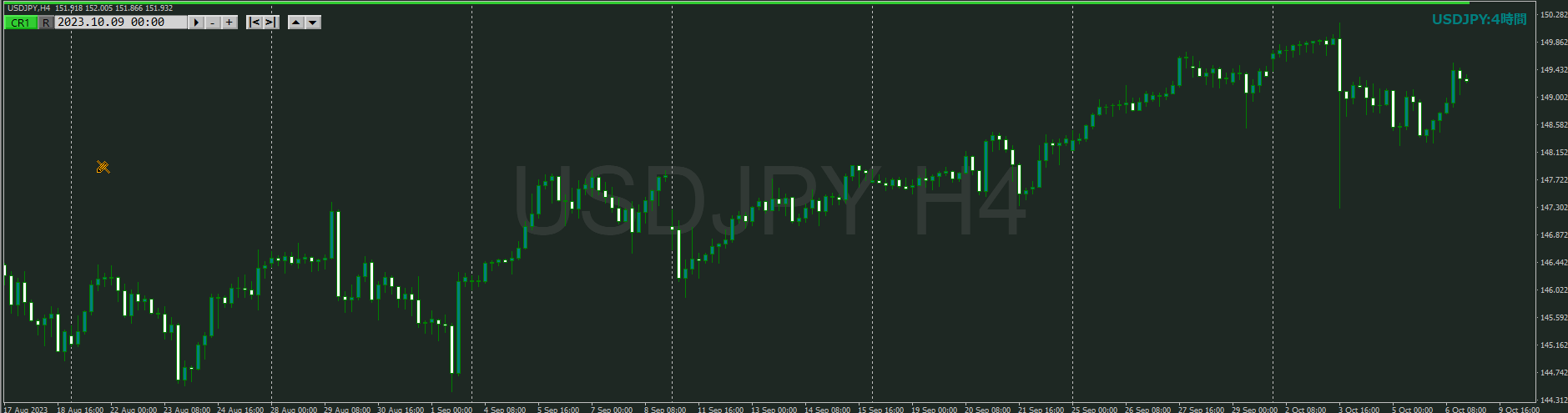 下落チャネルに沿って巡行して、高値付近から戻している状況は昨日と変わらないが、十字線で戻されているのか4時間で確認する