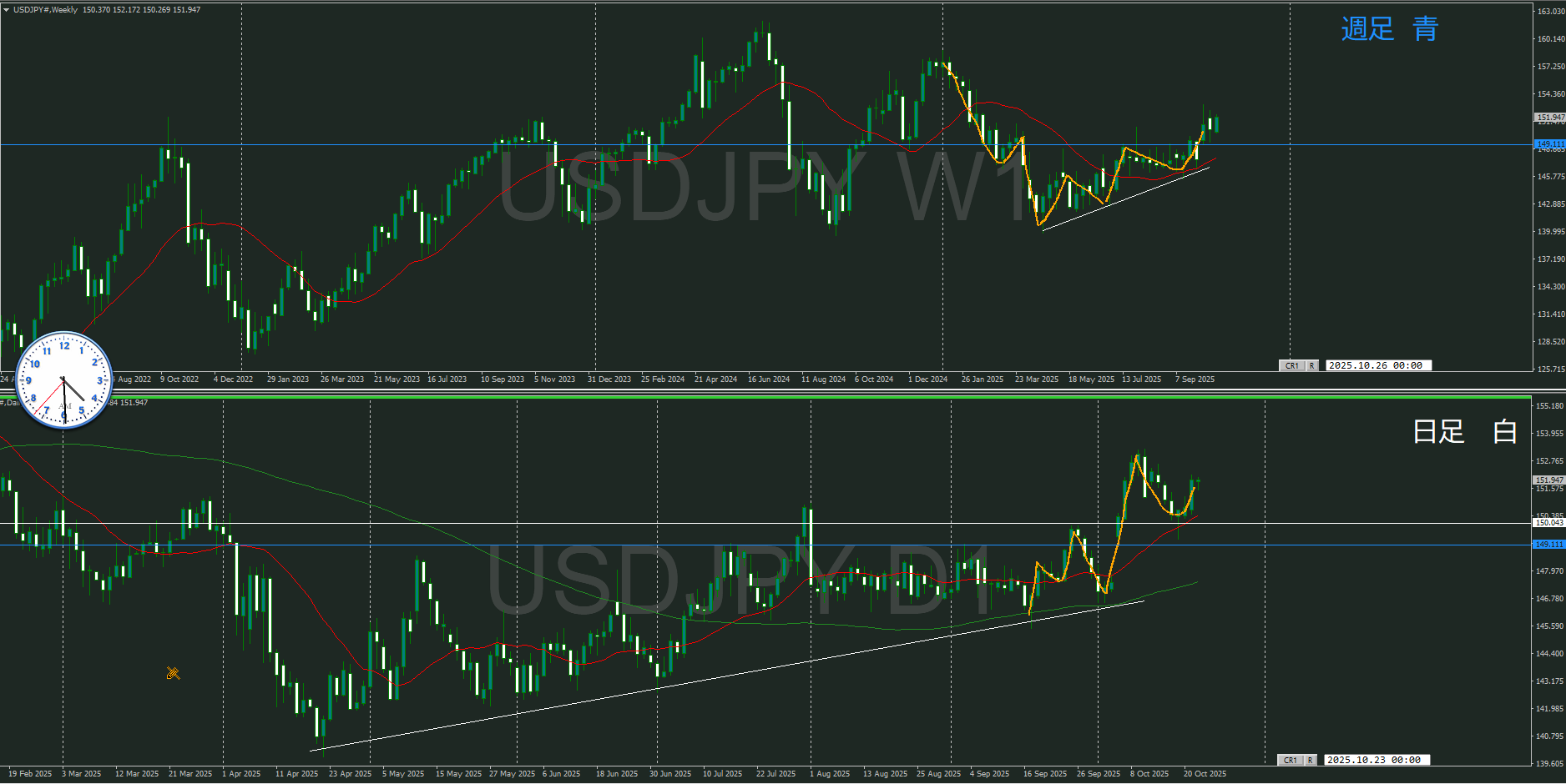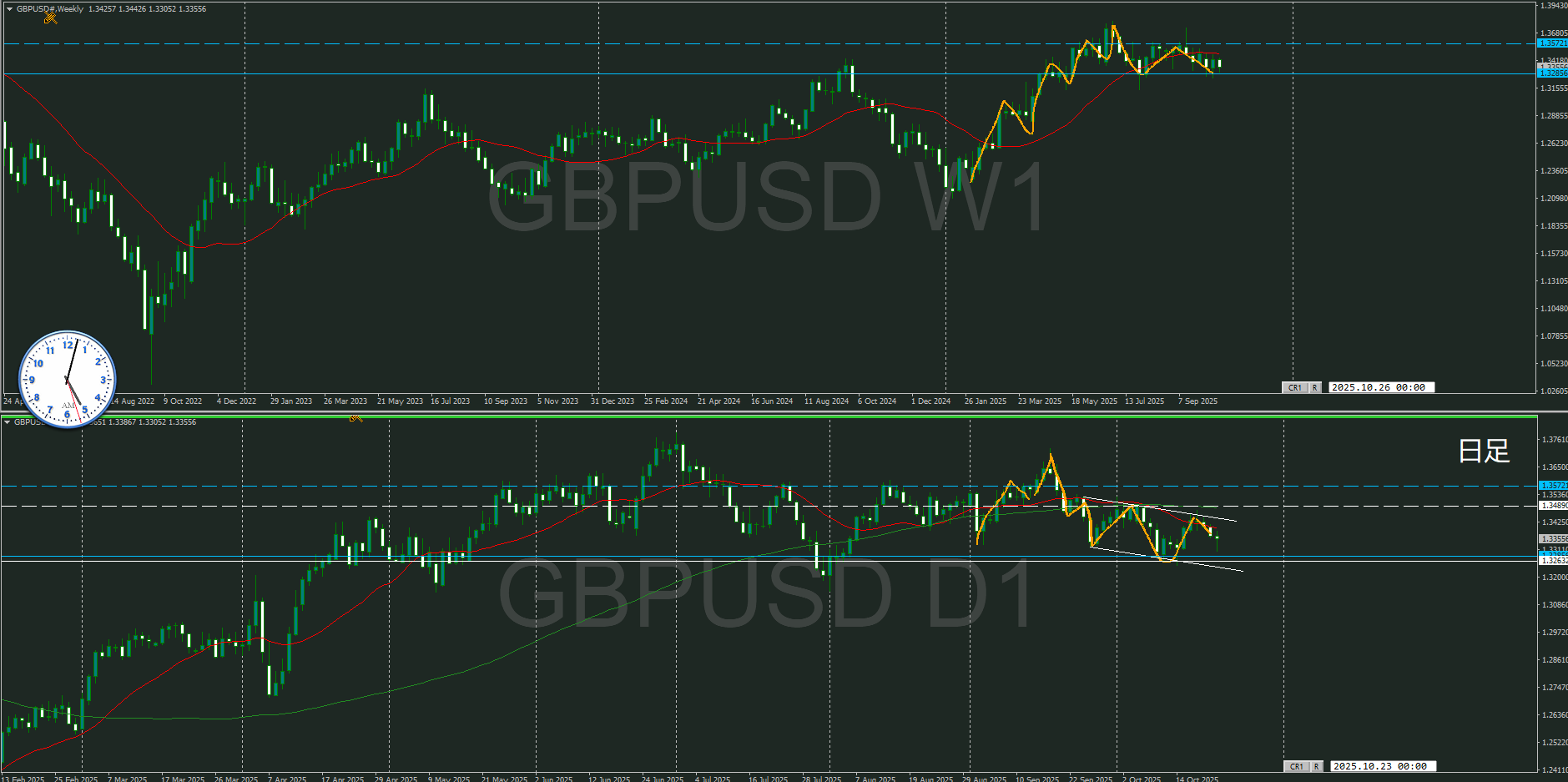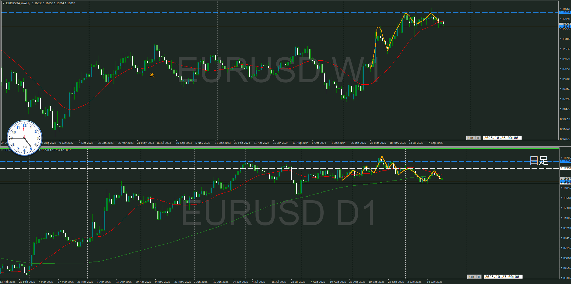 週足の影響をどう見てくのかによって日足と闘っている様にもみえるが、そこを考えると難しくなりすぎるので、日足の動いを注視していく