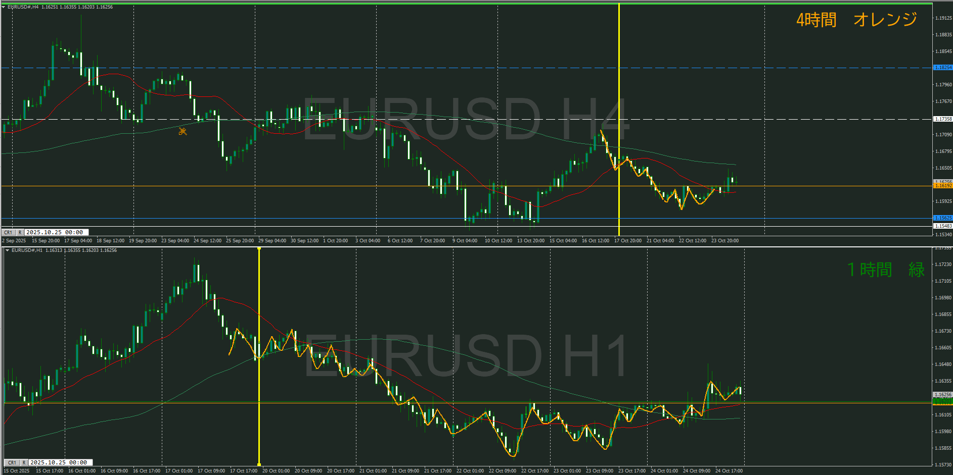 火曜日のロング(青い線)が4時間の押し目買いとして獲れるところ