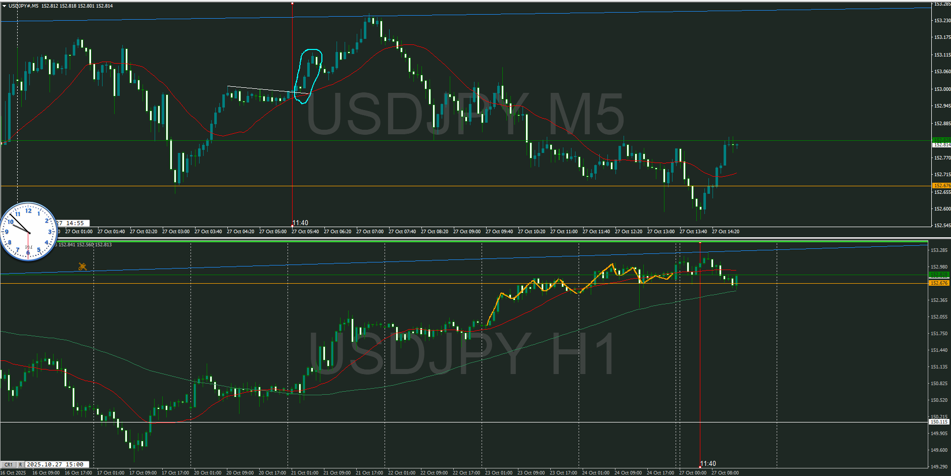 1時間の押し目で11時40分、5分で見える斜めの攻防ラインを超えてきた