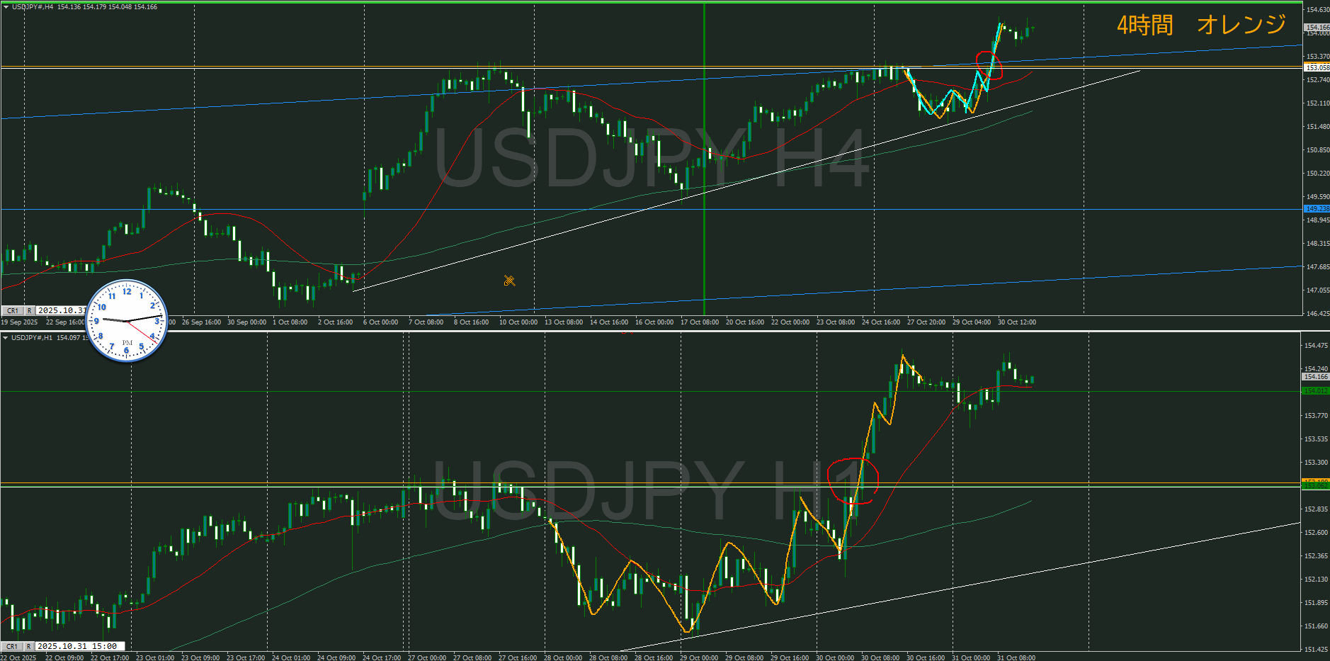 4時間足レベルで週足のチャネルラインを超えてきて、勢いが強すぎ節目が見当たらない