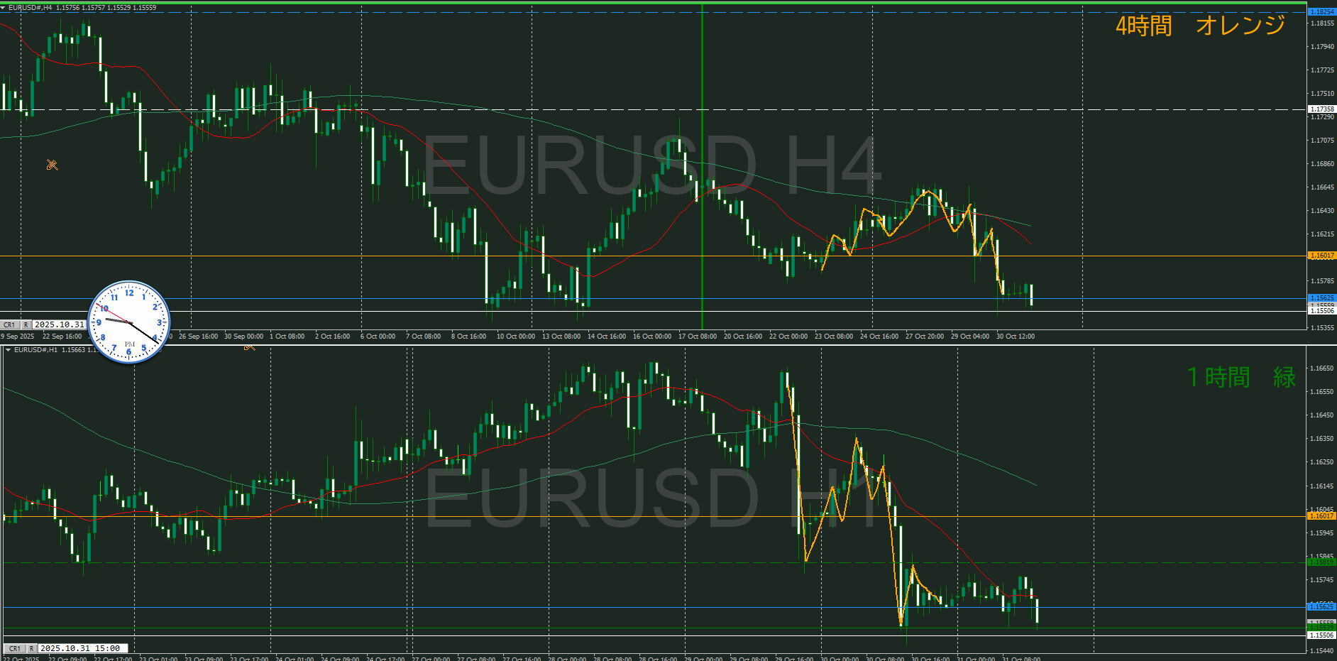 4時間を調整と視ると、このあとの1時間の戻り売りを待ちたいところ