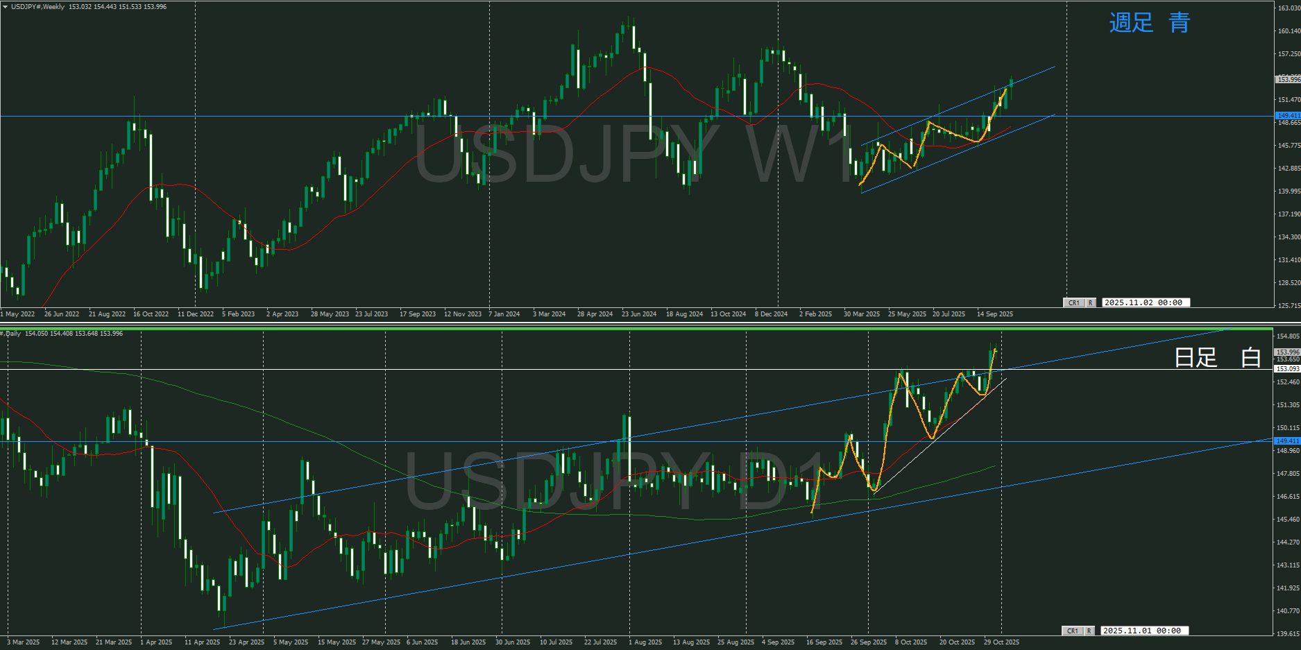 上昇チャネルライン上限を超えはじめてきたところ