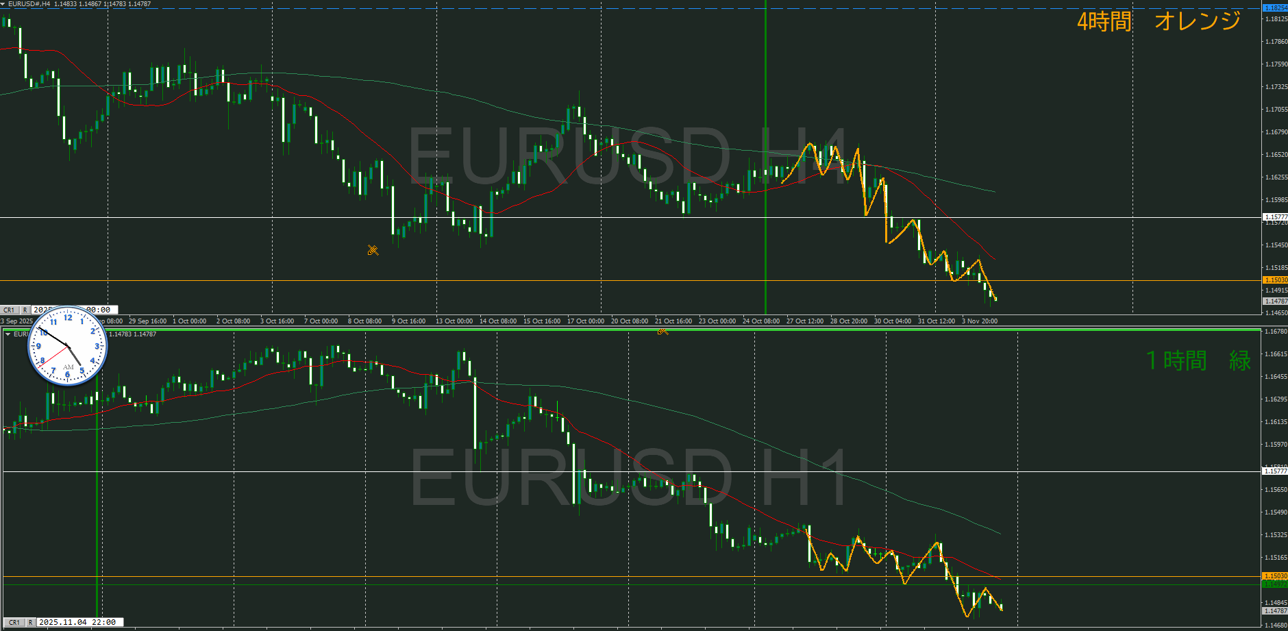 4時間のオレンジの水平線まで戻して来て、戻り売り勢力の存在確認後、売りを検討する