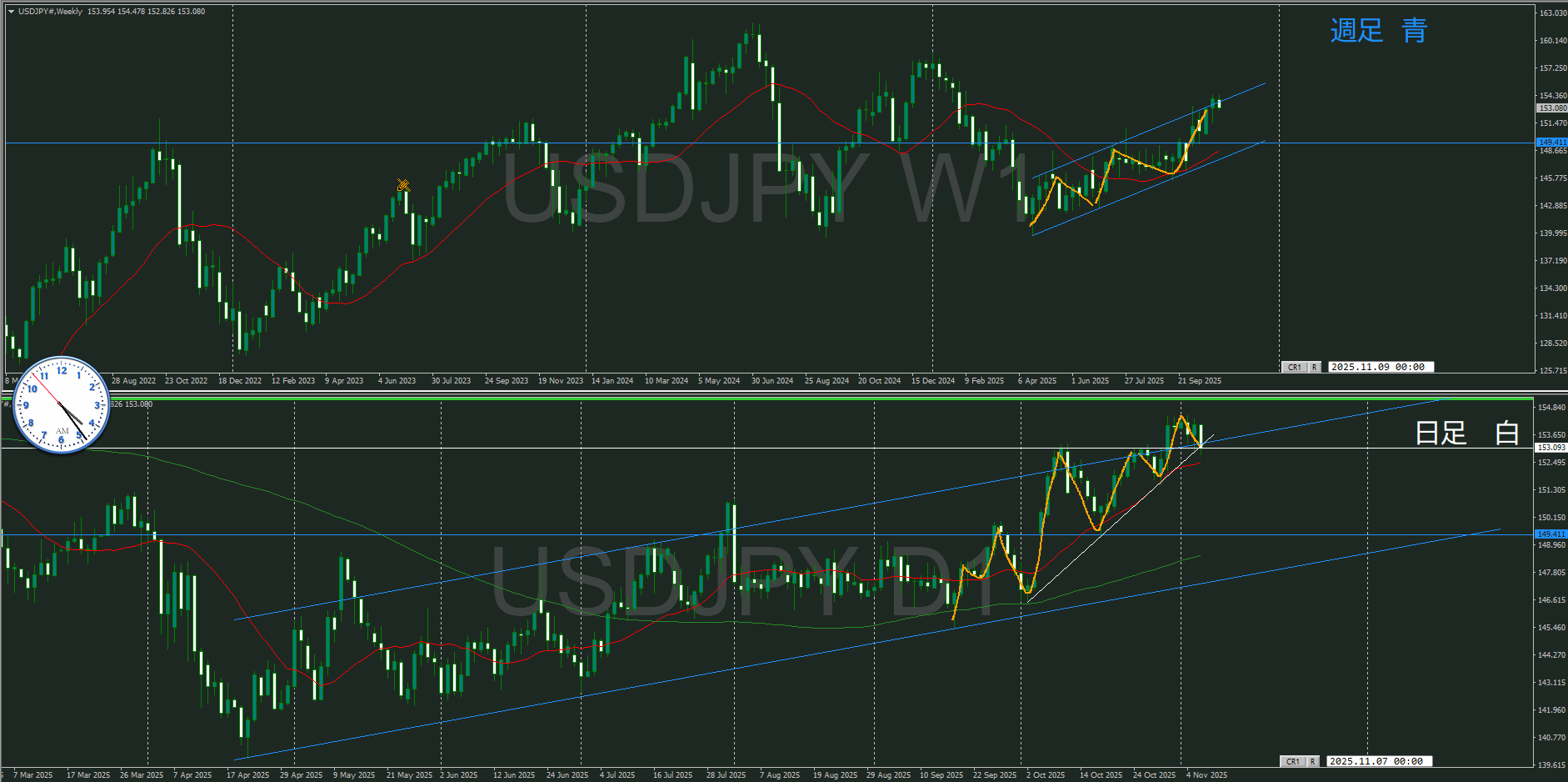 上昇チャネルライン上限を超えはじめていたが、実体から視ると明確に超えたとは言えない