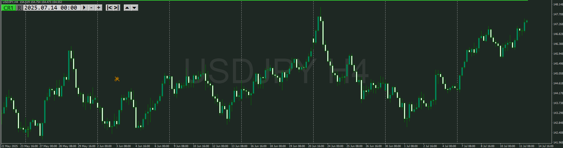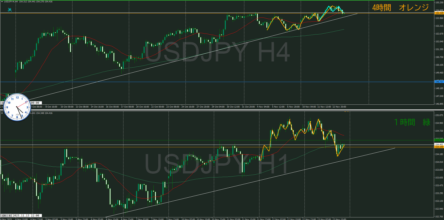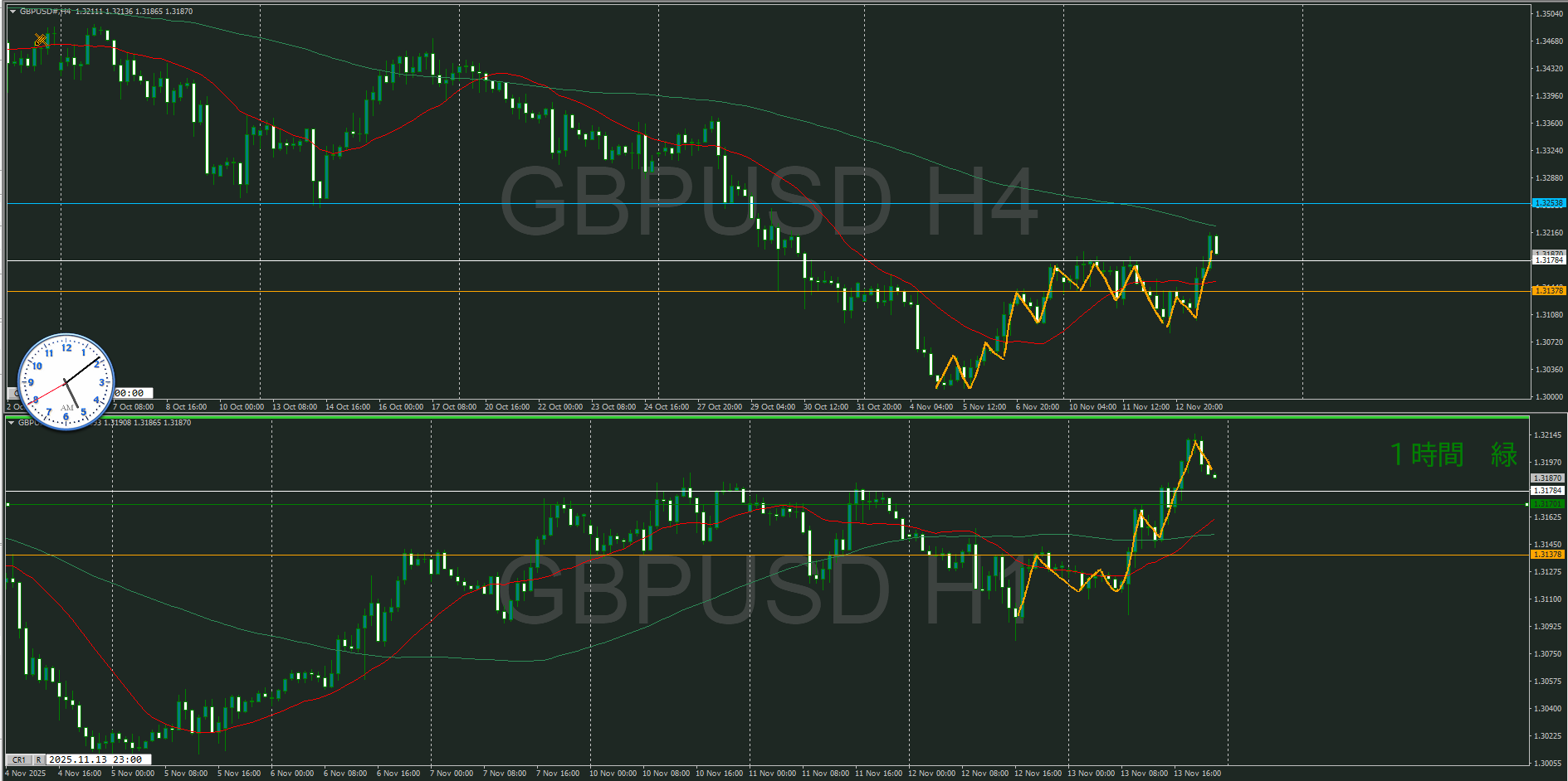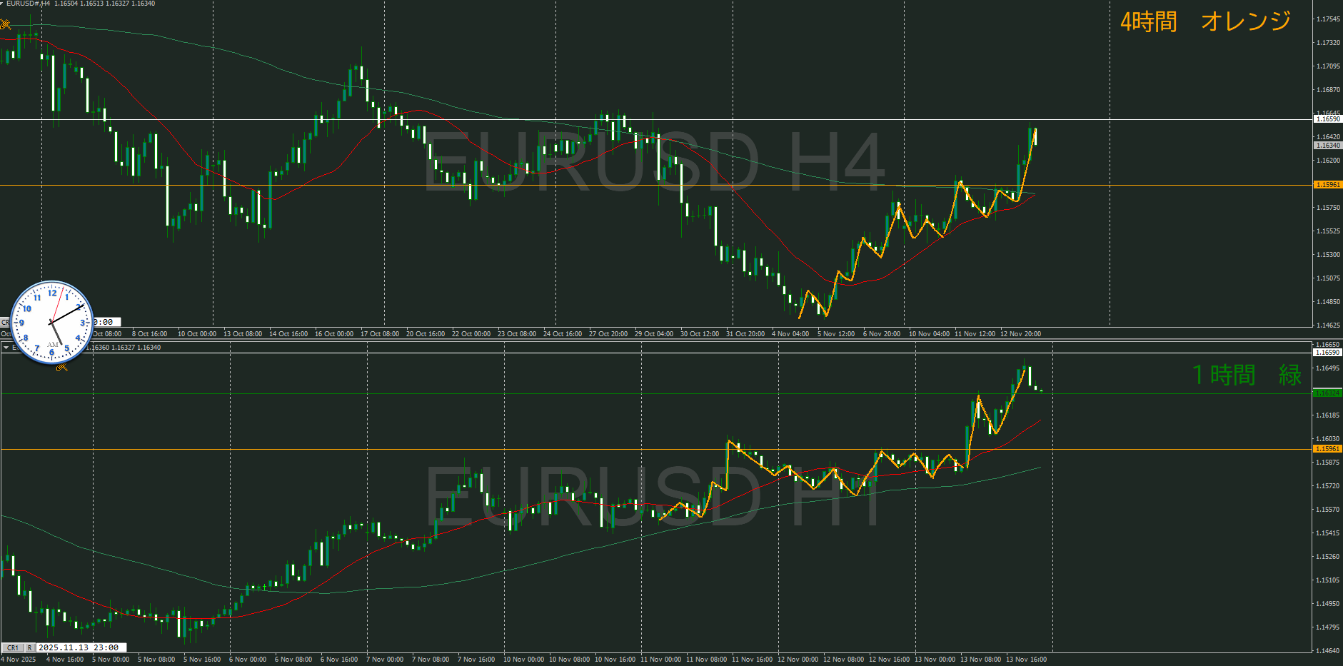 1時間方向 上 調整から上昇トレンドが発生し押している波の途中