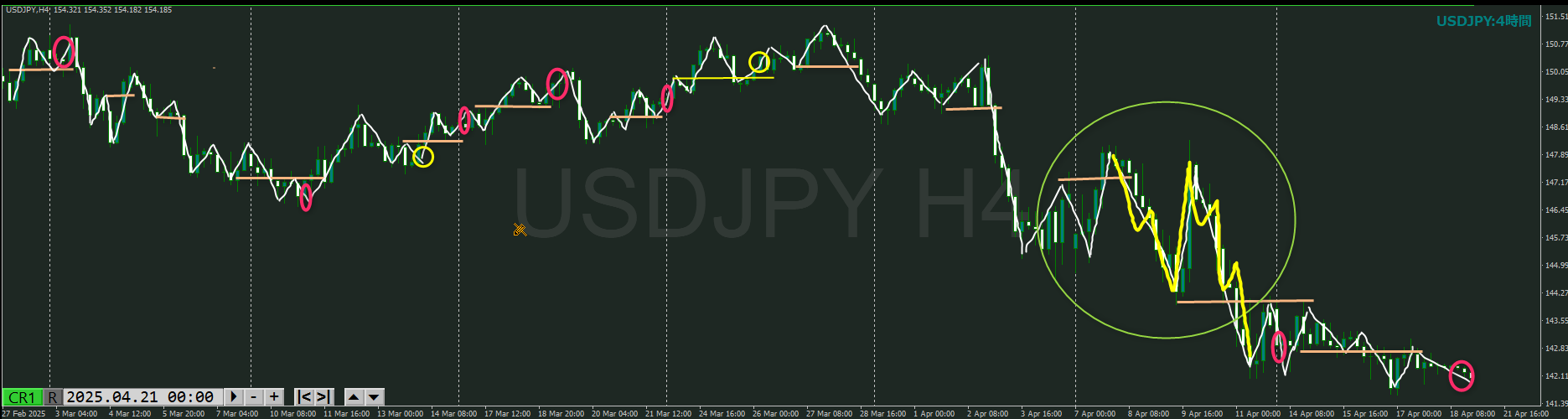 4時間の下落トレンド発生を待つぐらいで日足の戻り売りと重なるか