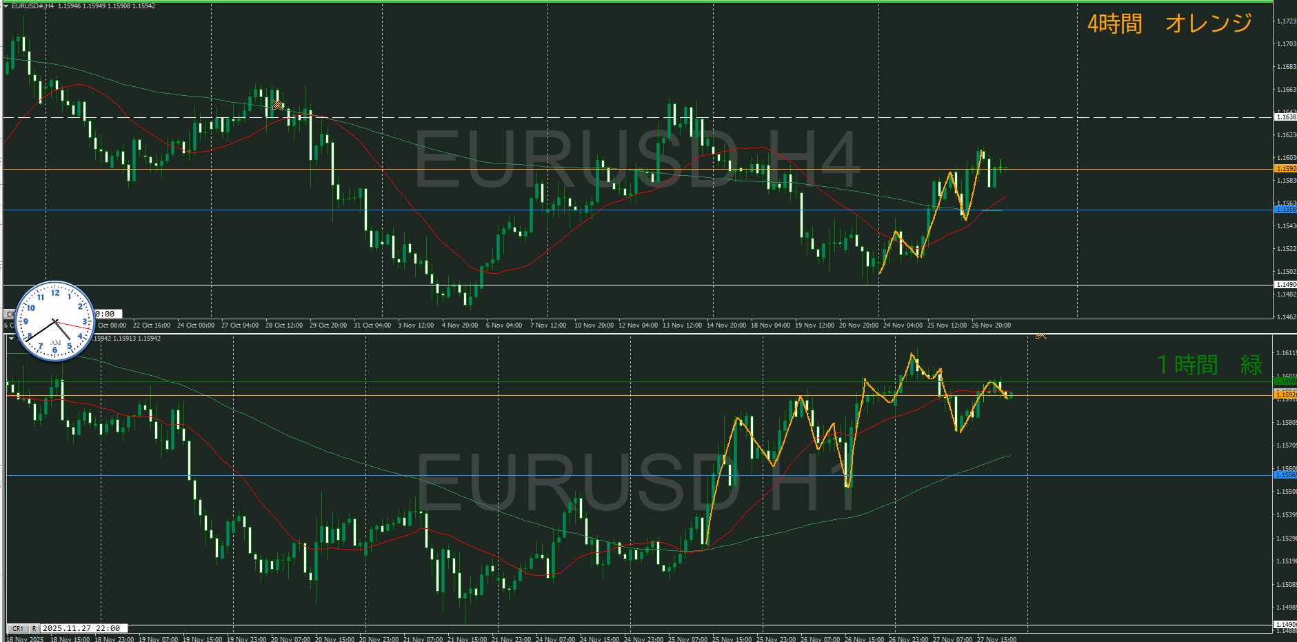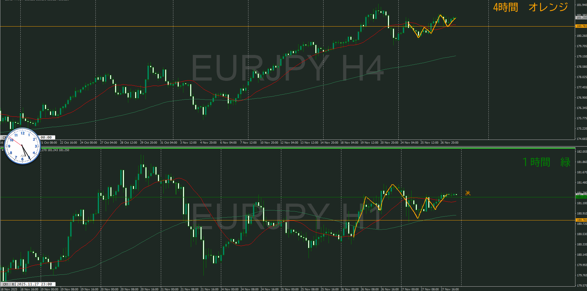 4時間はまだ下だが、日足が押している波の途中なのか、まだ押してくるのかが微妙なところ