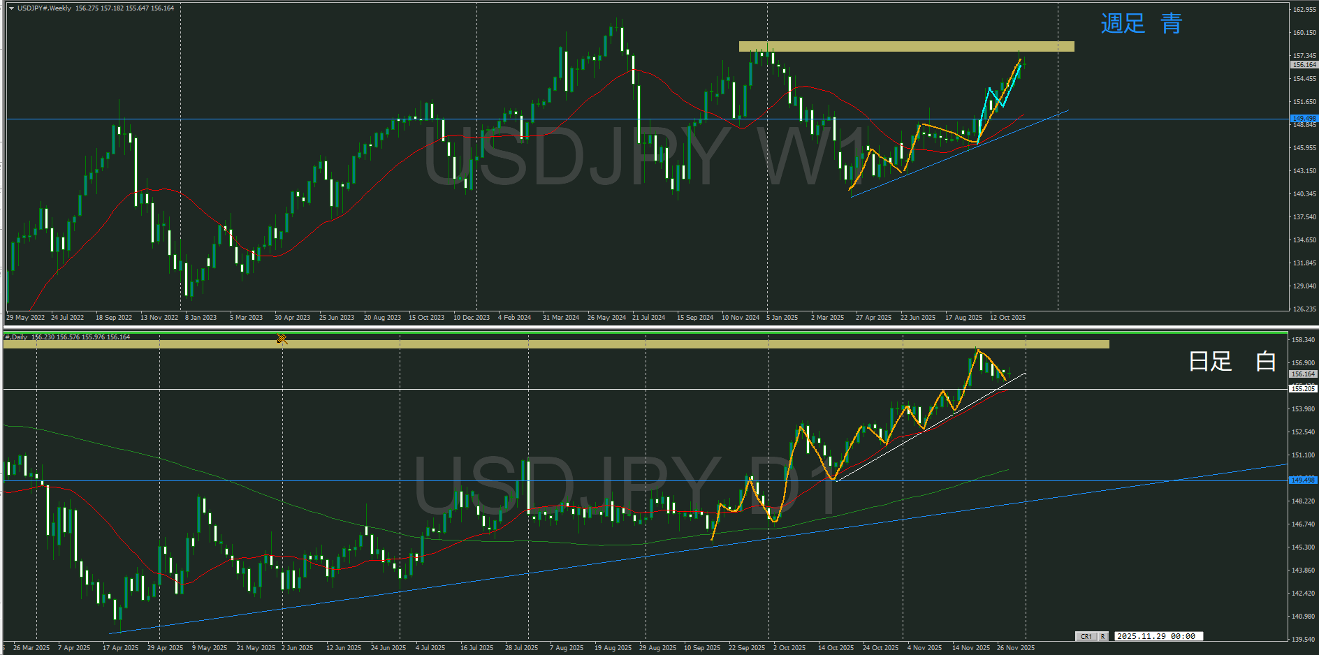 日足の斜めで支えられるのか、抜けていくのかが直近の焦点かなと思う