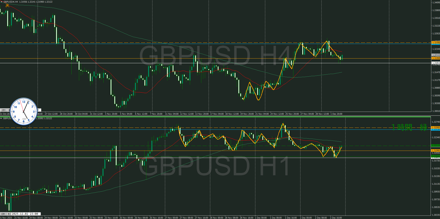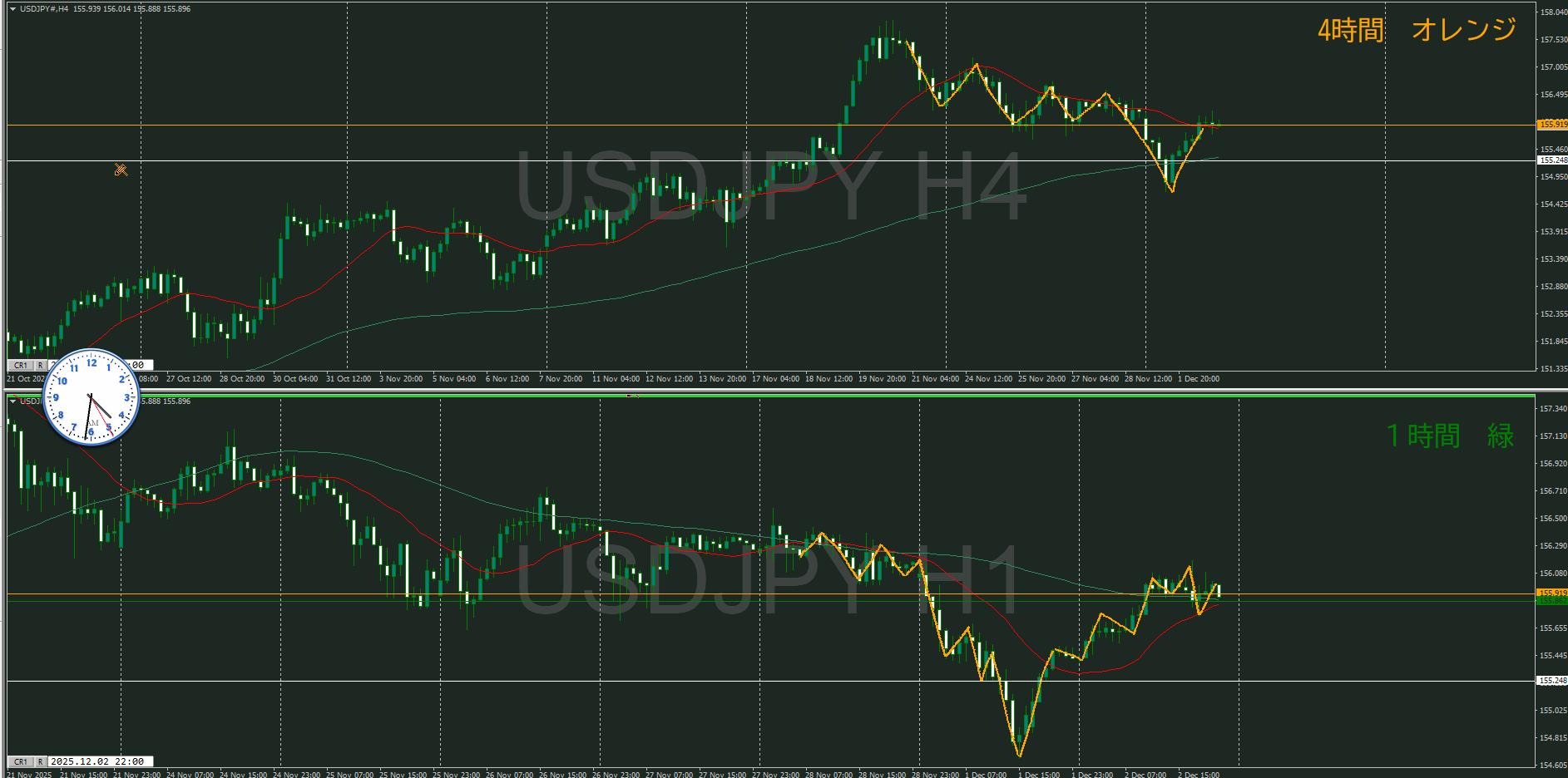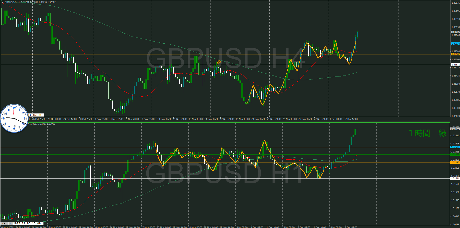 まだ、4時間の買いに優位性が残っているが、4時間の形が普通ではないので1時間の上昇トレンド発生を待ちたい
