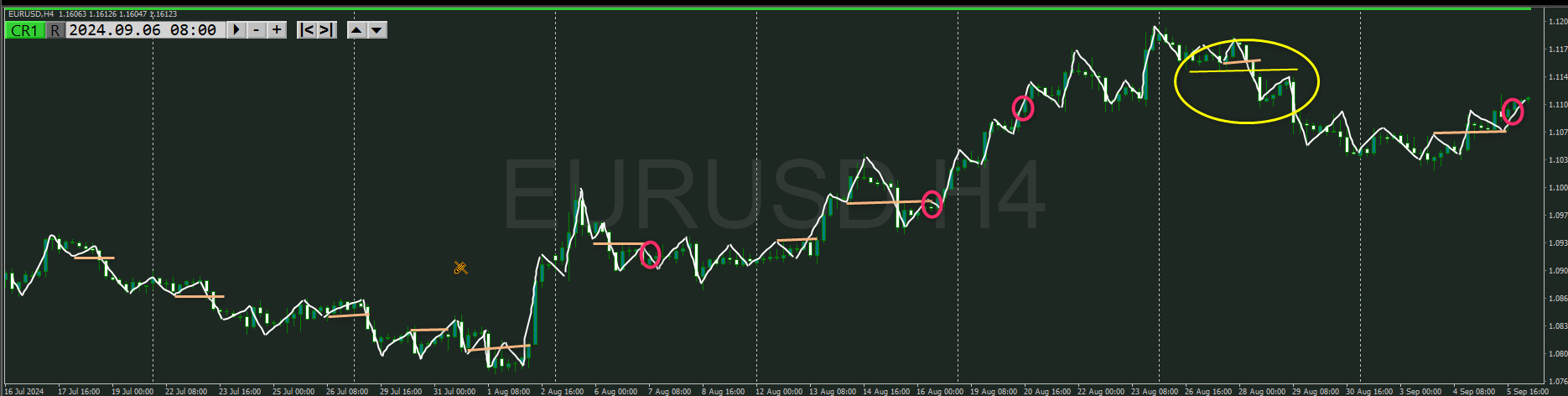 破線 直近高値のヒゲを折って前回高値と揃っているラインを参照