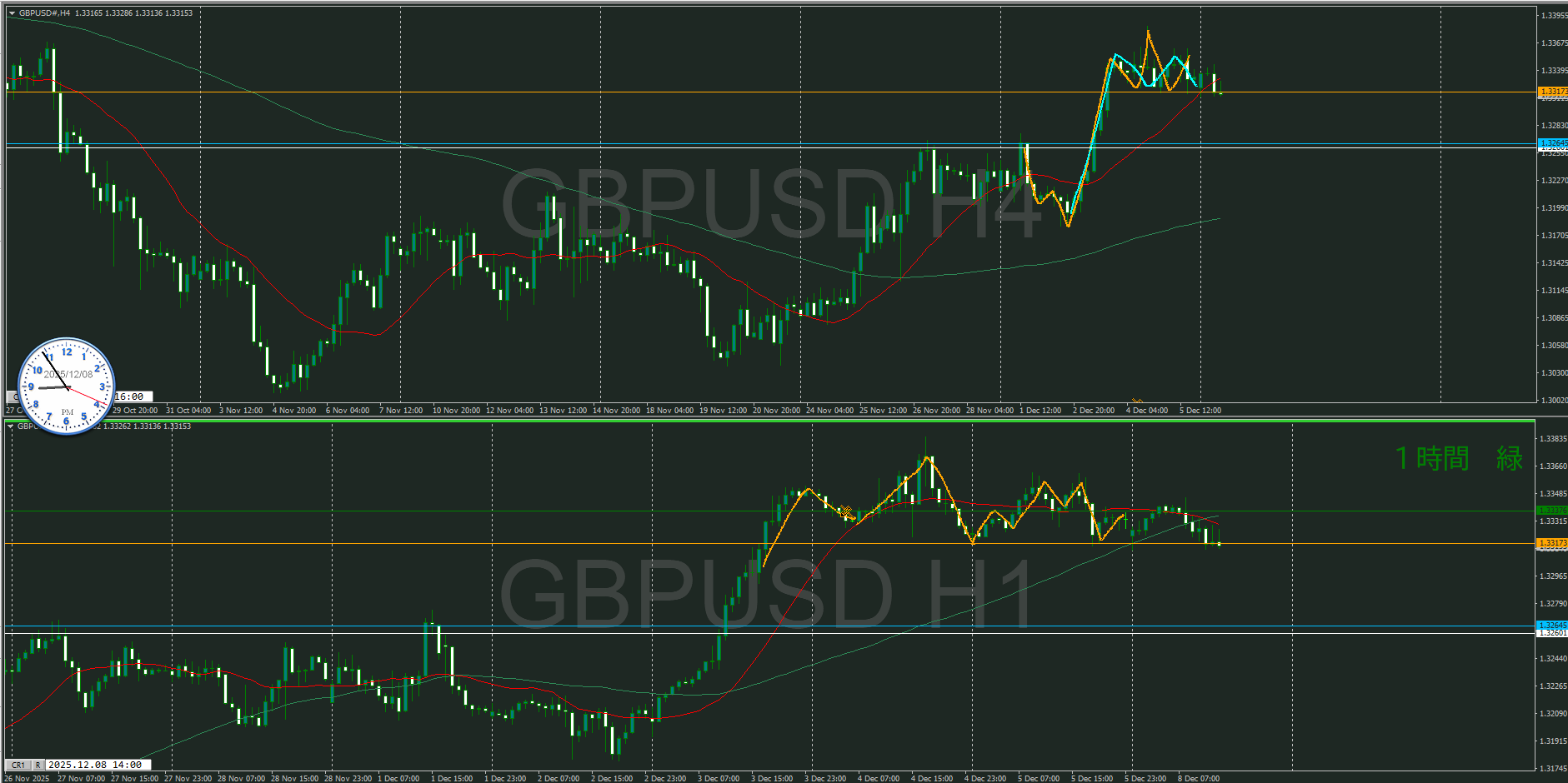 1時間を視ると、戻り売りが入り易い状況で4時間はMAに売り抑えられ易い