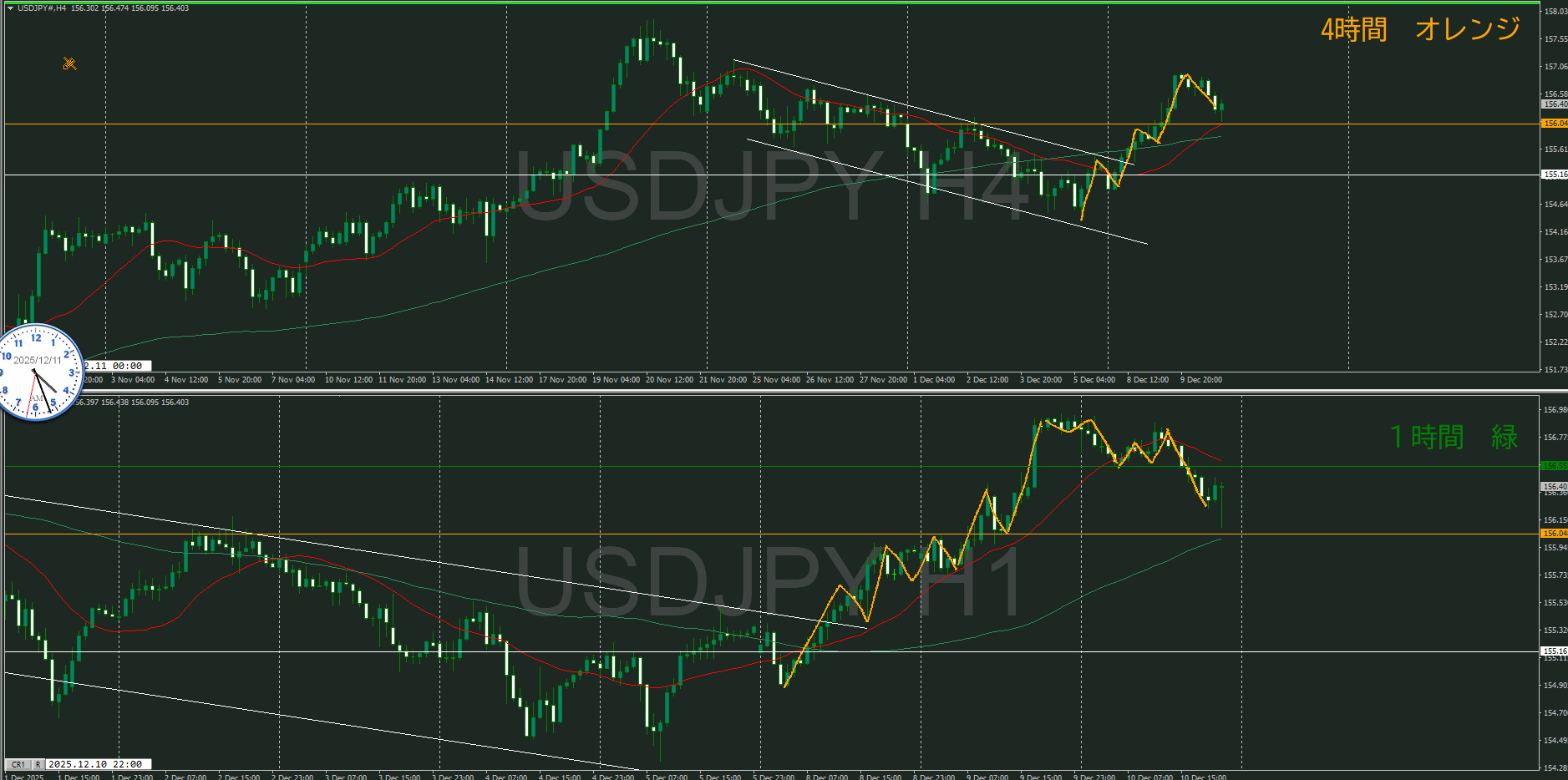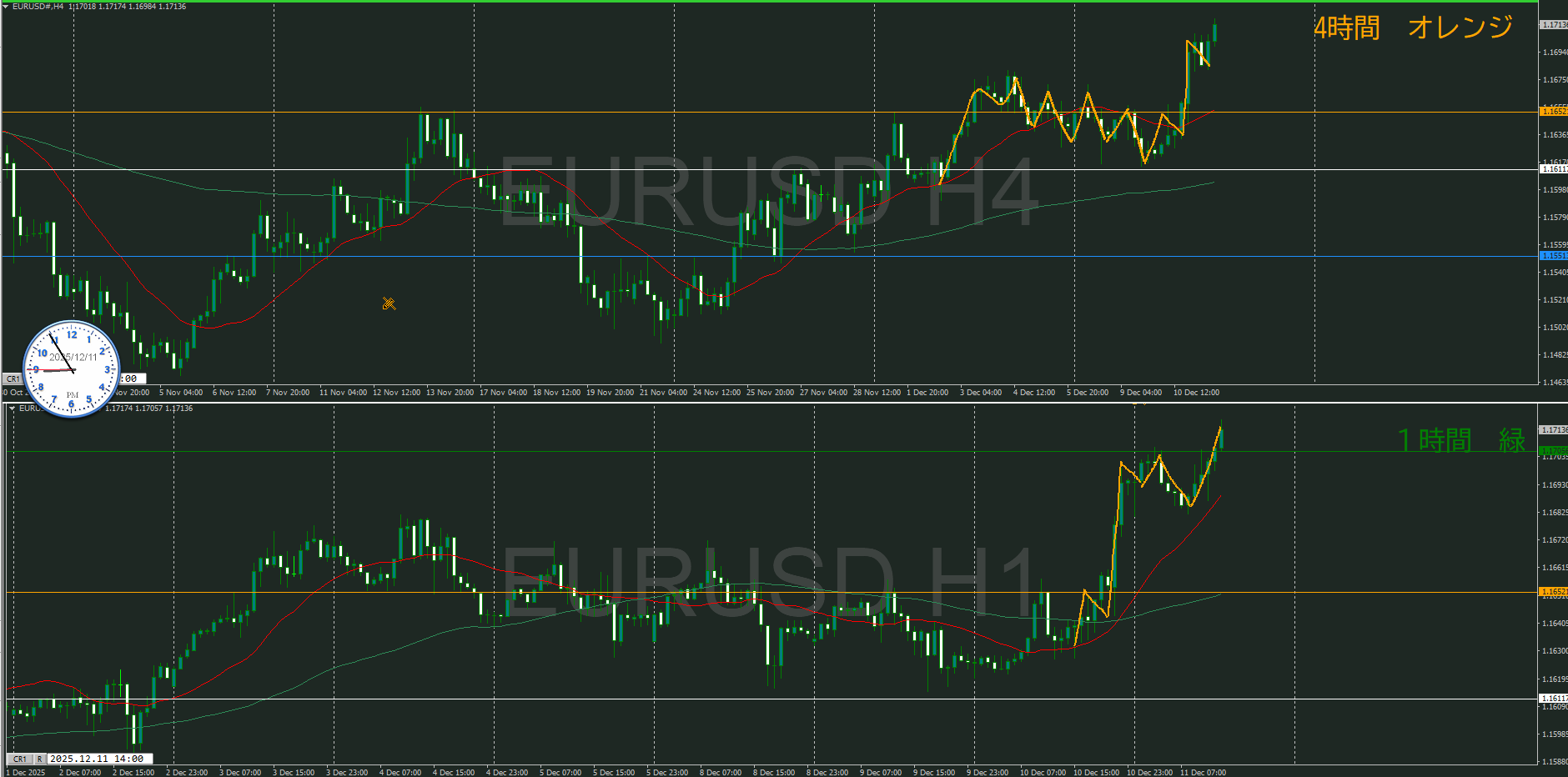 オレンジのラインで、1時間で視て押し目買い勢力の存在確認ができたらロングを狙う