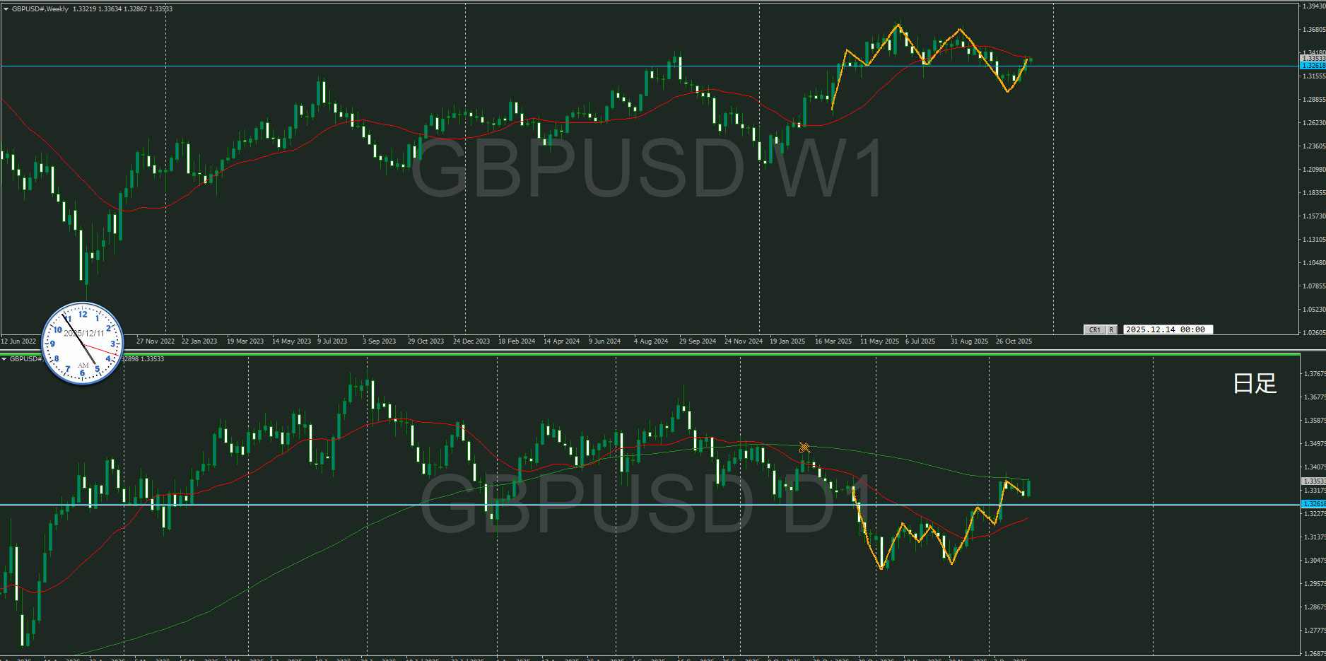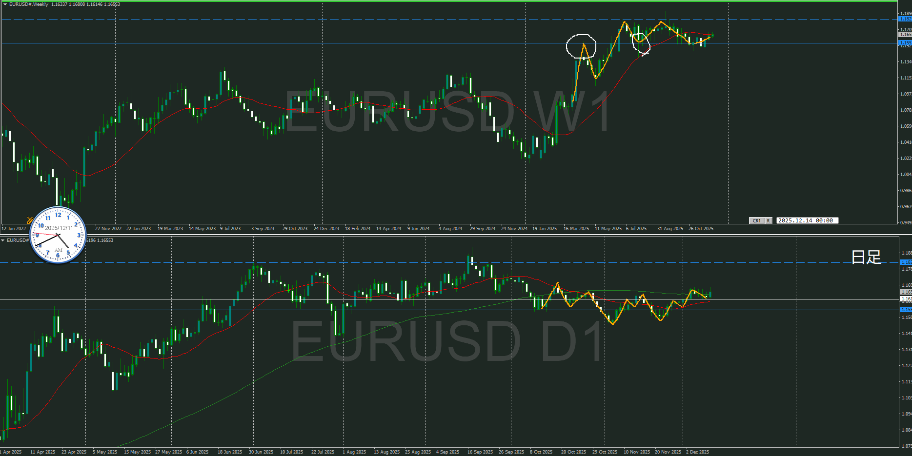 週足と日足MAに挟まている状況で、週足MAは下向き、日足MAは上向き