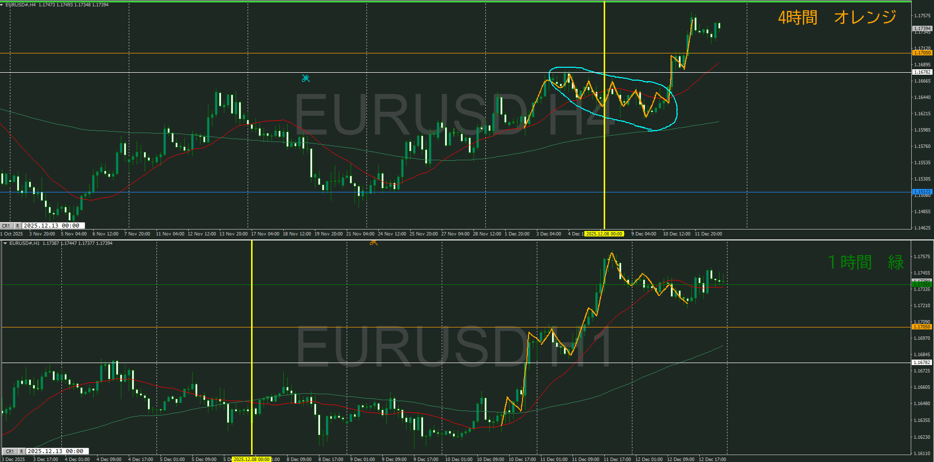 4時間では縦に追える波が視えていたが、獲りに行くとオーバーナイトになり、加えて日足のサポート(白い水平線)も居るのでホールドできるポイントではないとサクッと獲って寝るシナリオでエントリ