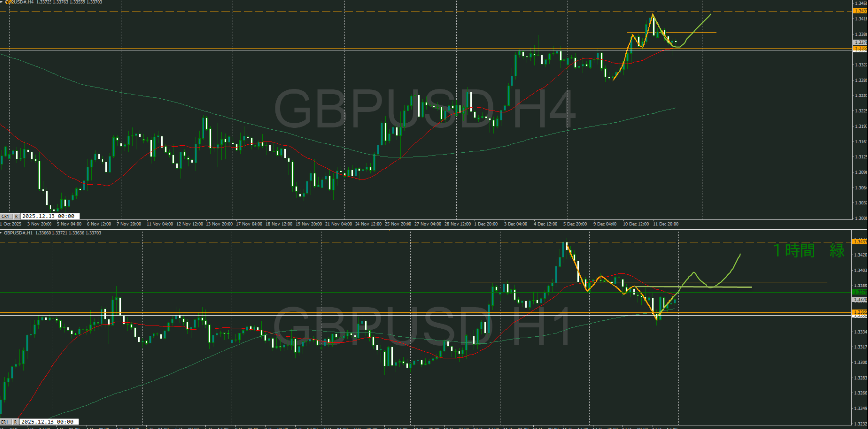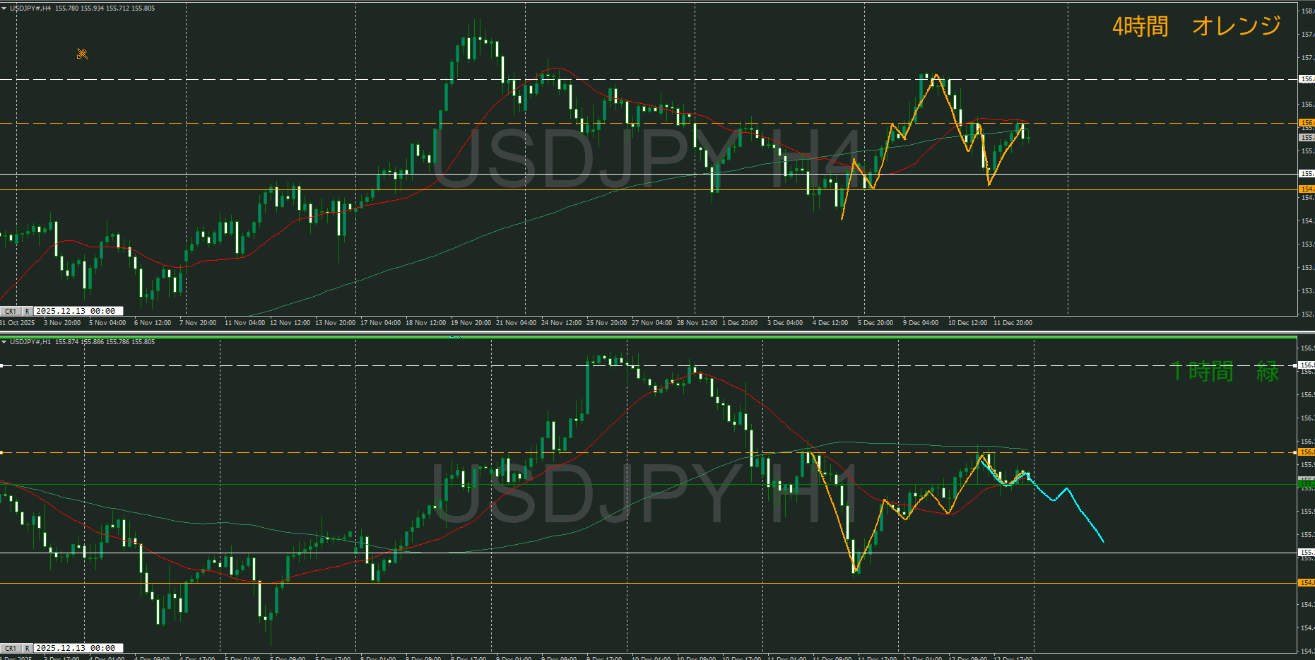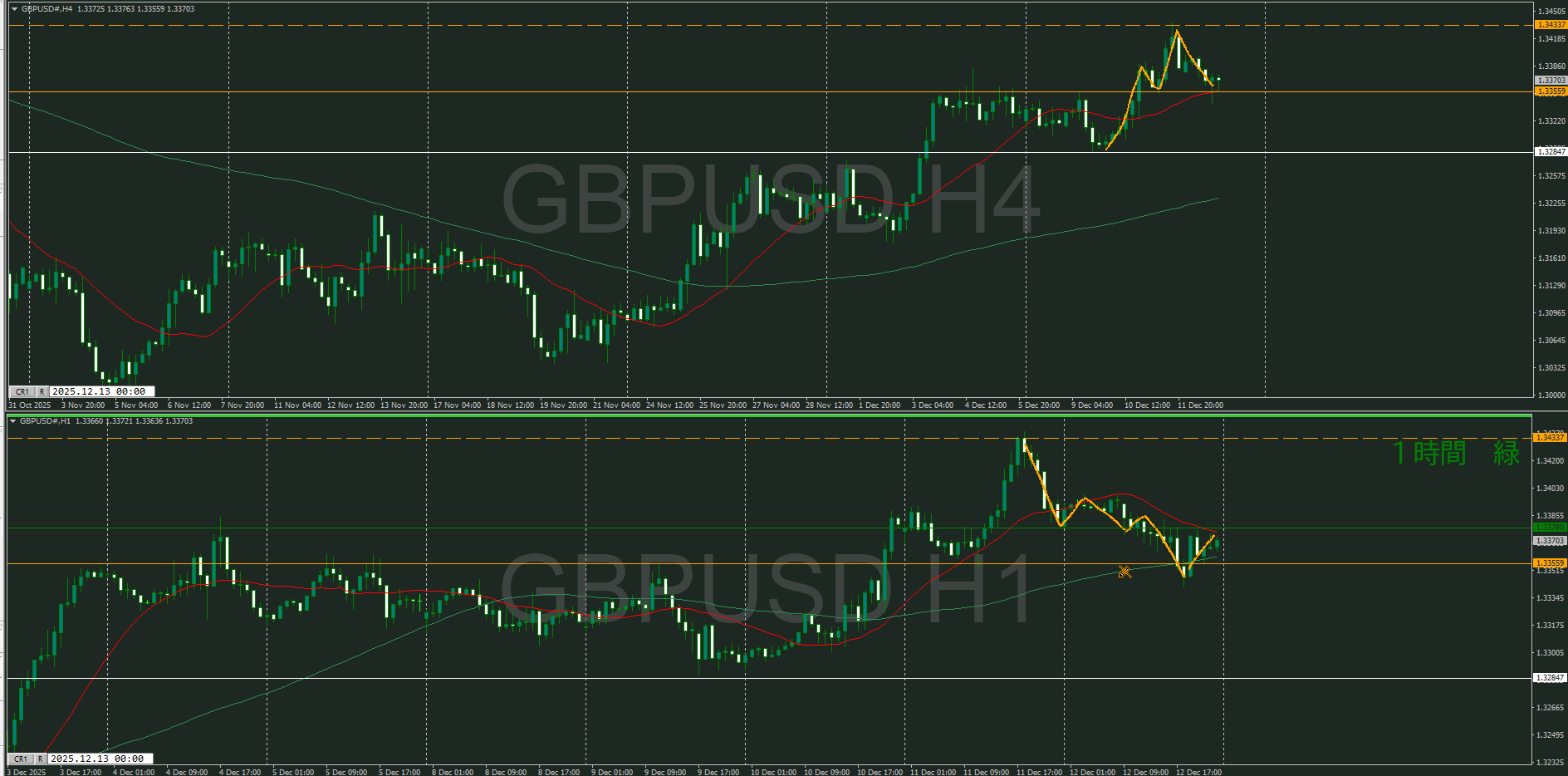 何となく売りが優勢に感じるが、4時間の全戻し対策で1時間の下落トレンド発生を待ってショート狙いか