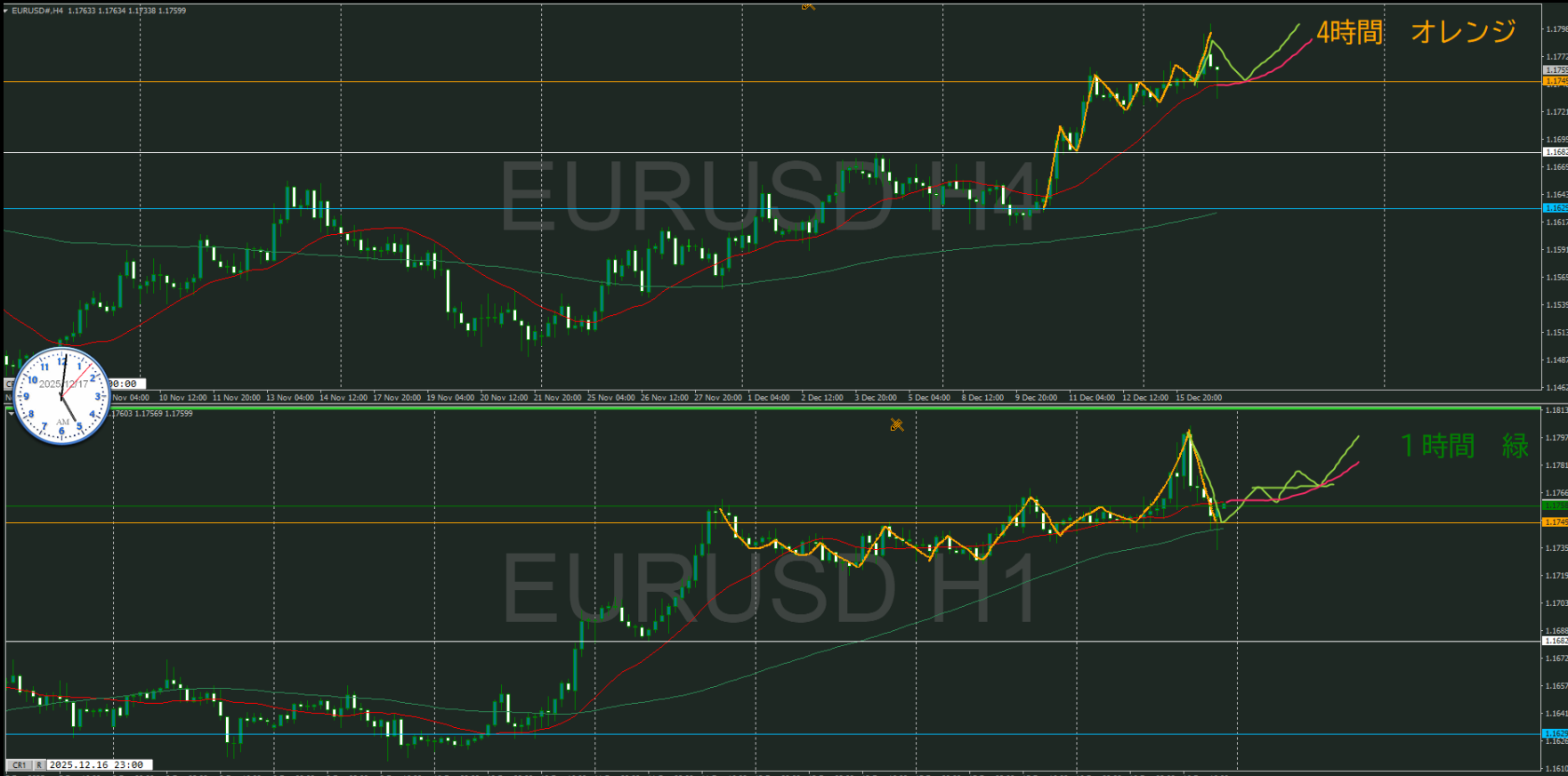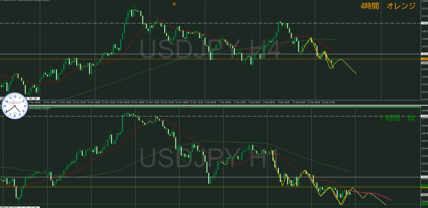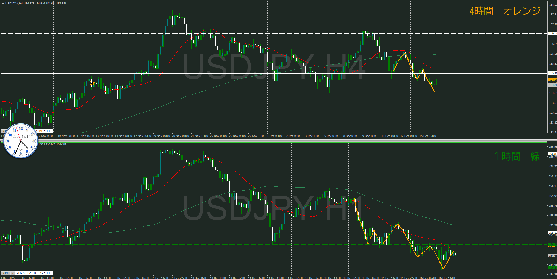 オレンジの水平線の下に1時間の買い支える勢力が居る可能性があるが、まだ高値を超えていないので水平線は移動していない