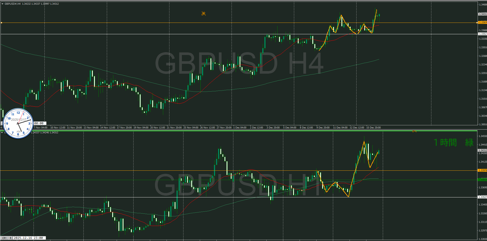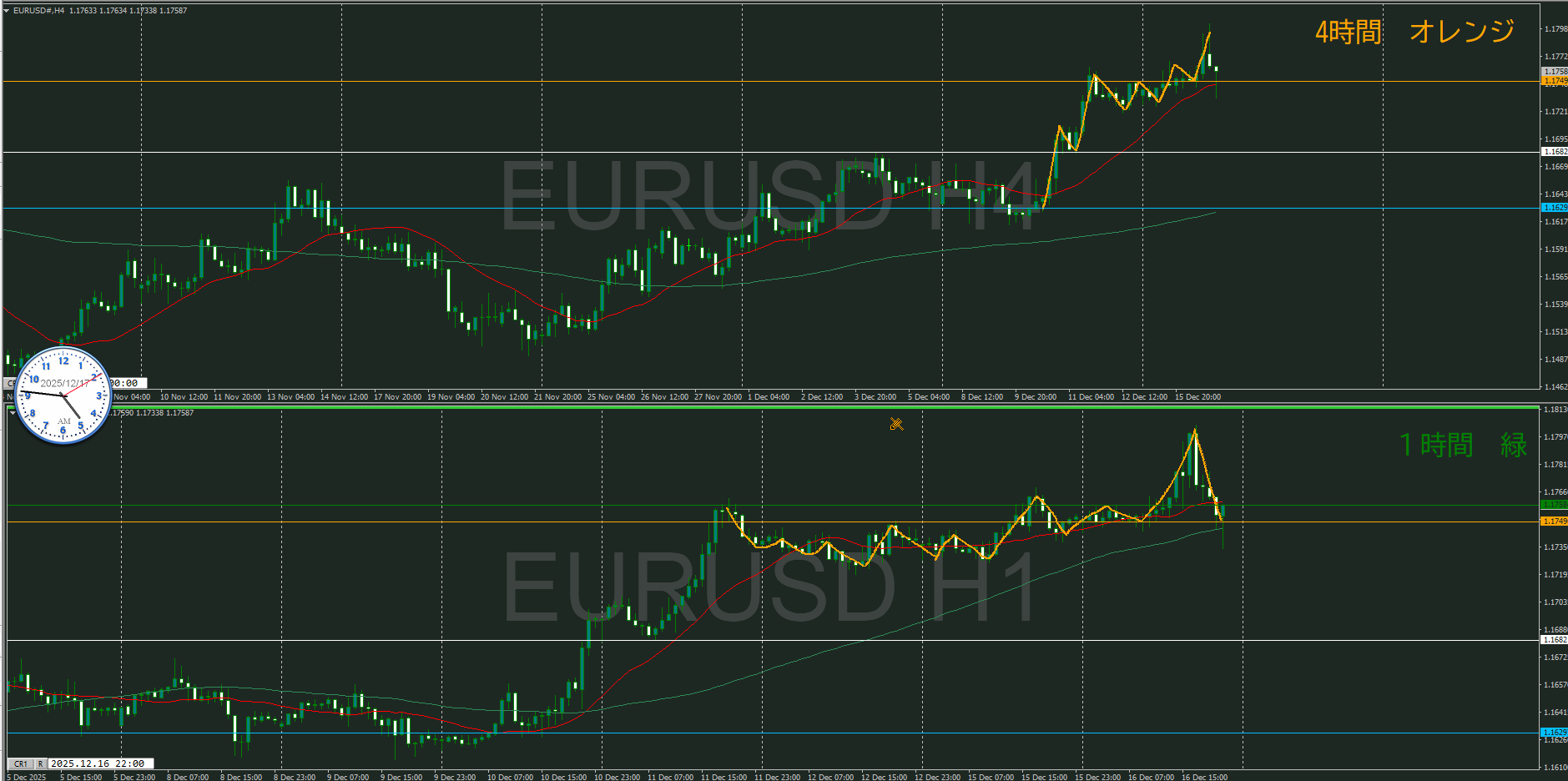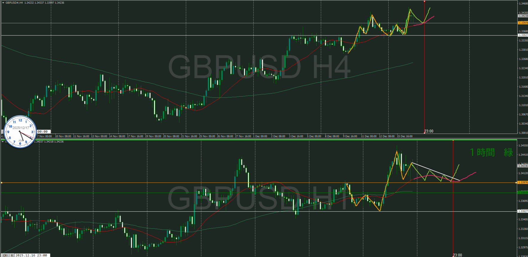 オレンジの水平線の下に1時間の買い支える勢力が居る可能性があるが、まだ高値を超えていないので水平線は移動していない