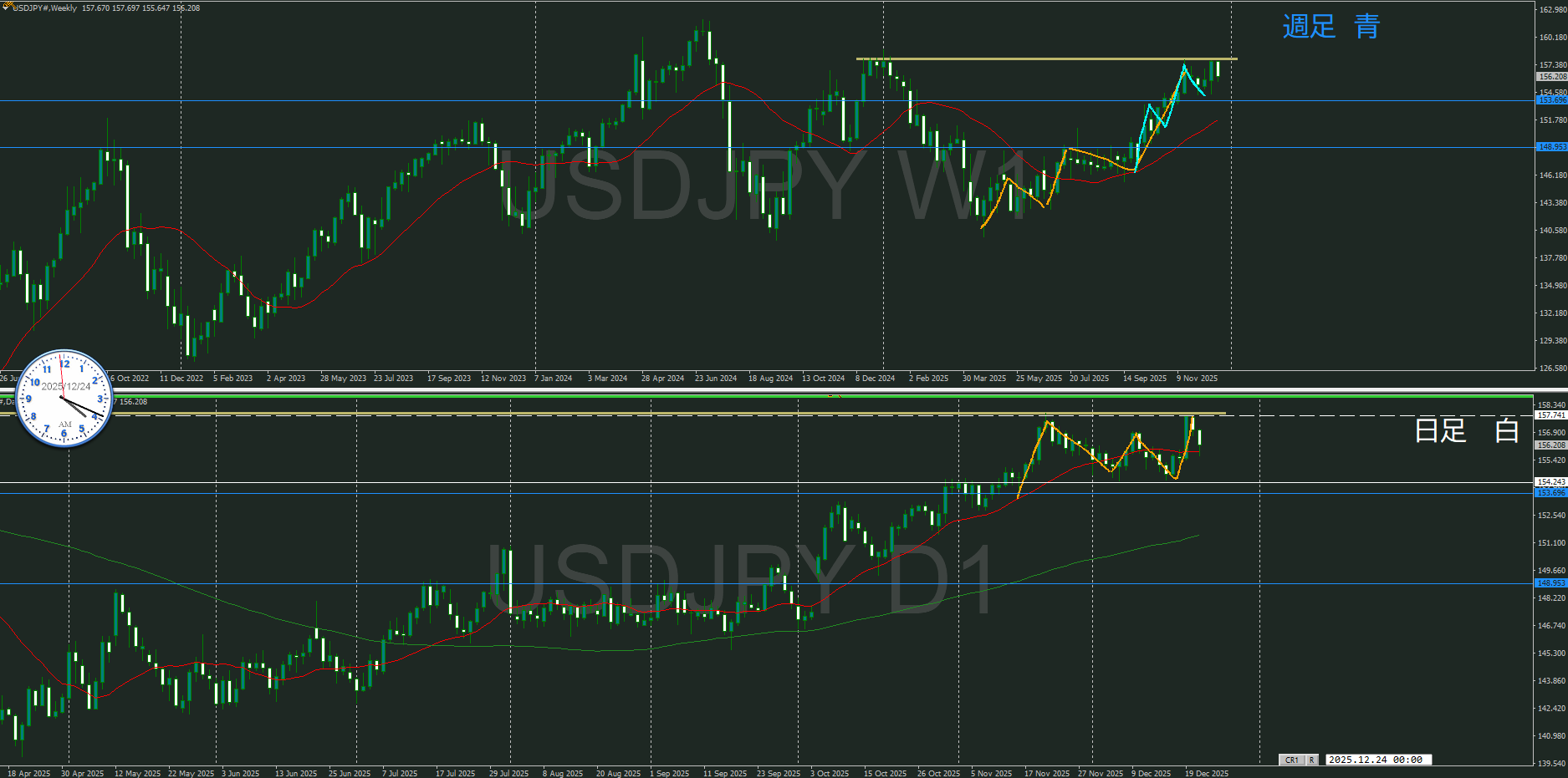 どちらにしても、月足クラスの高値圏で意識されている様子が視えてている