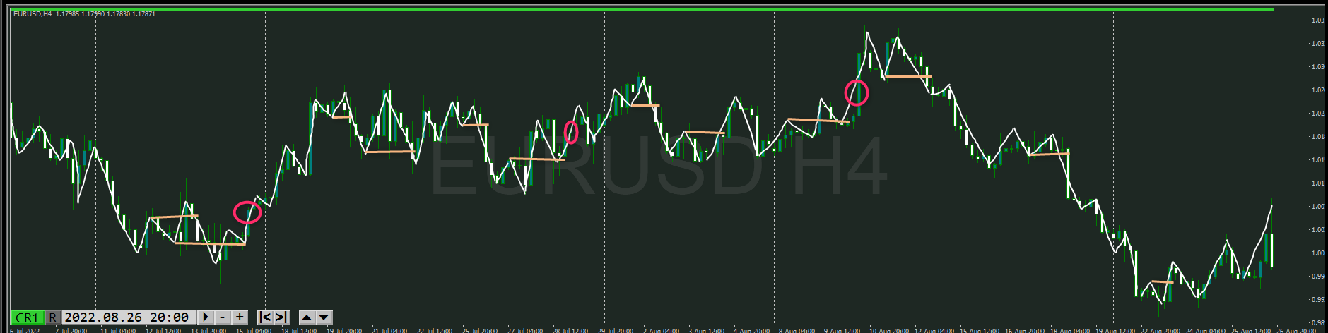 高安値を切り上がたと視て、赤丸で反応しているラインを参照