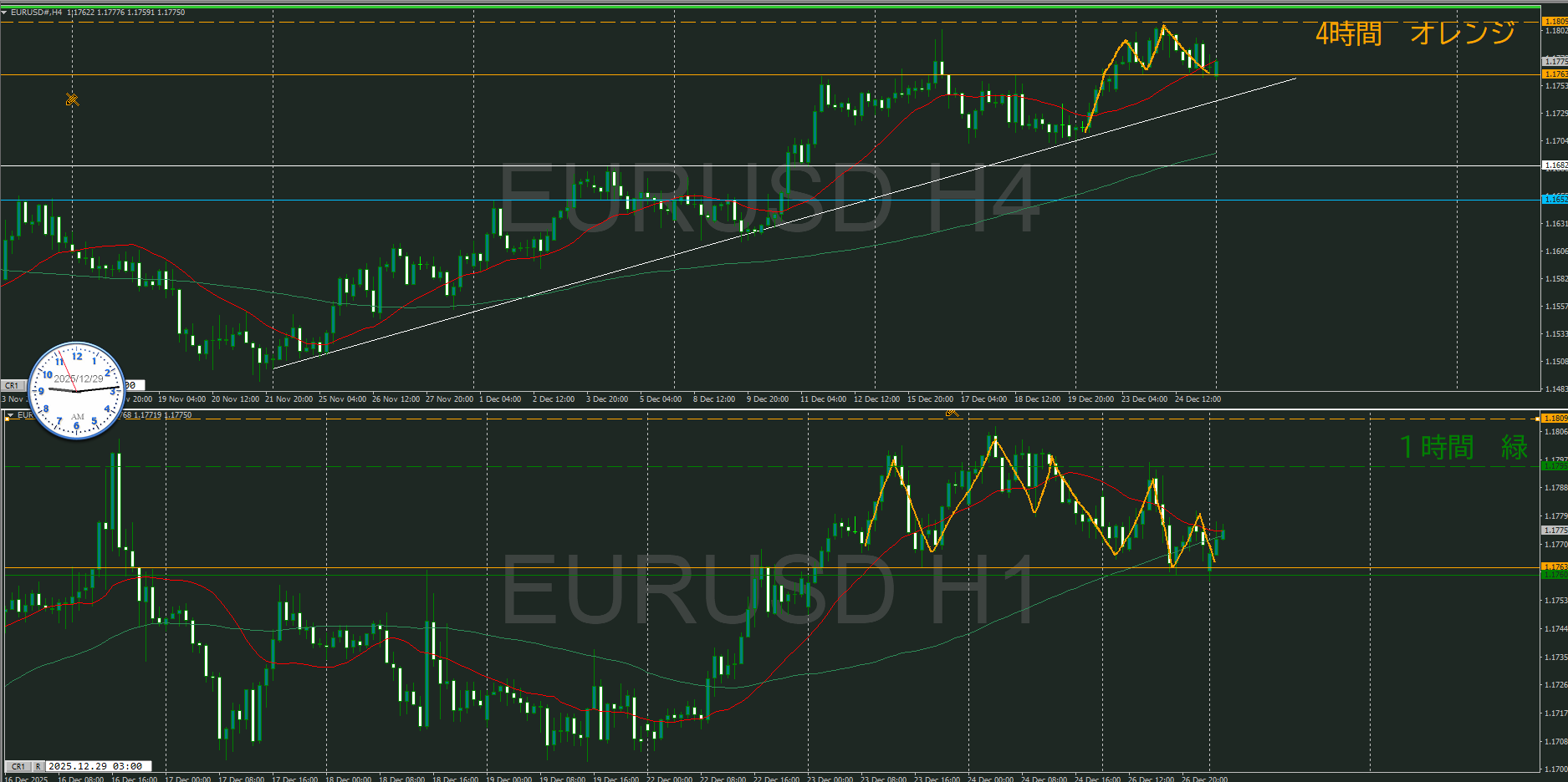 前回高値を割っていると視たいところだけど、4時間と1時間のMAに支えられているので、判断が難しいところ