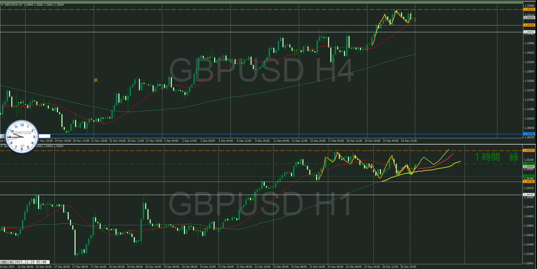 1時間では高値を割っているものの、4・1時間のMAに支えられているので、押し目買いが入ってくる可能性は考えられる