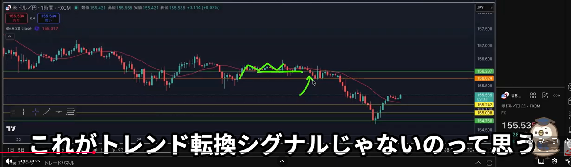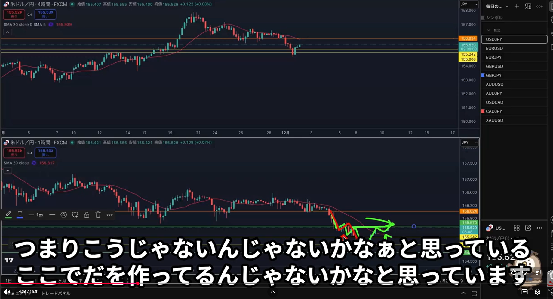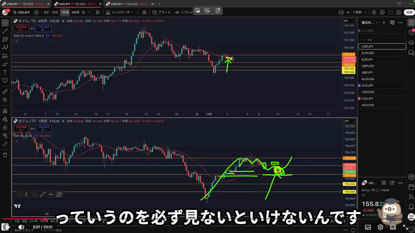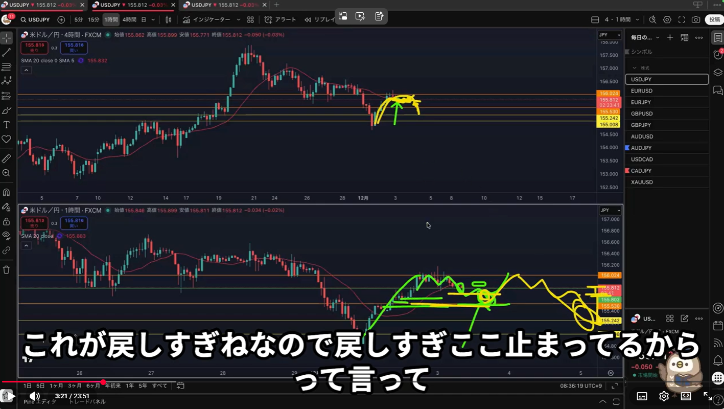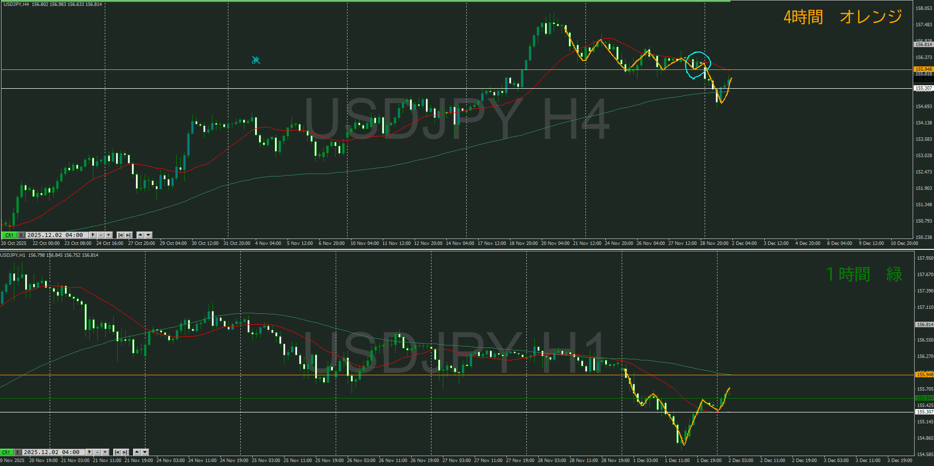4時間の半値付近から買い支える勢力を(1時間の下落をやり)過ごして、再度1時間で下落トレンド発生が起こる事がある