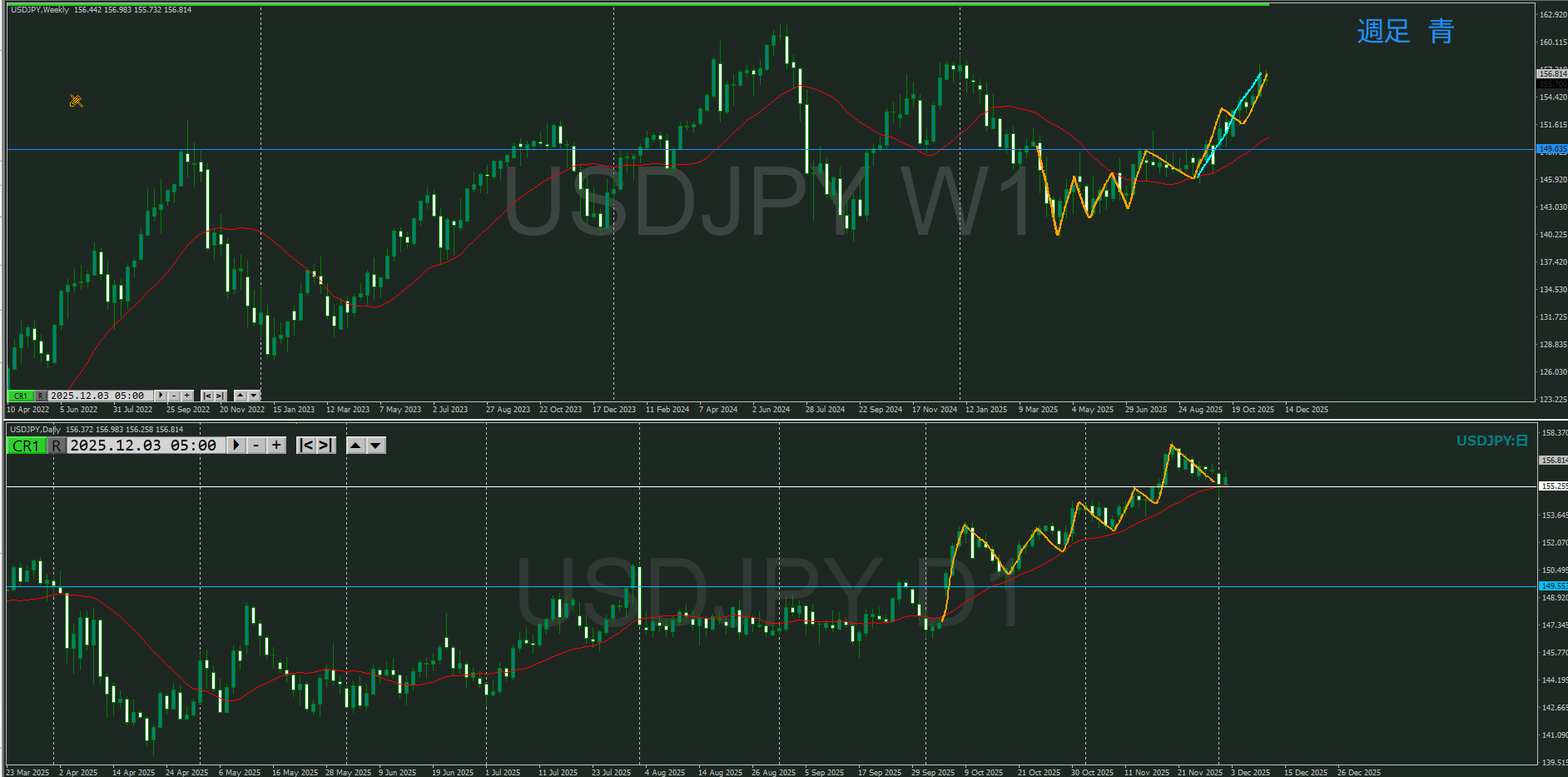 週足 方向上 上昇の波の途中2日と変わらず