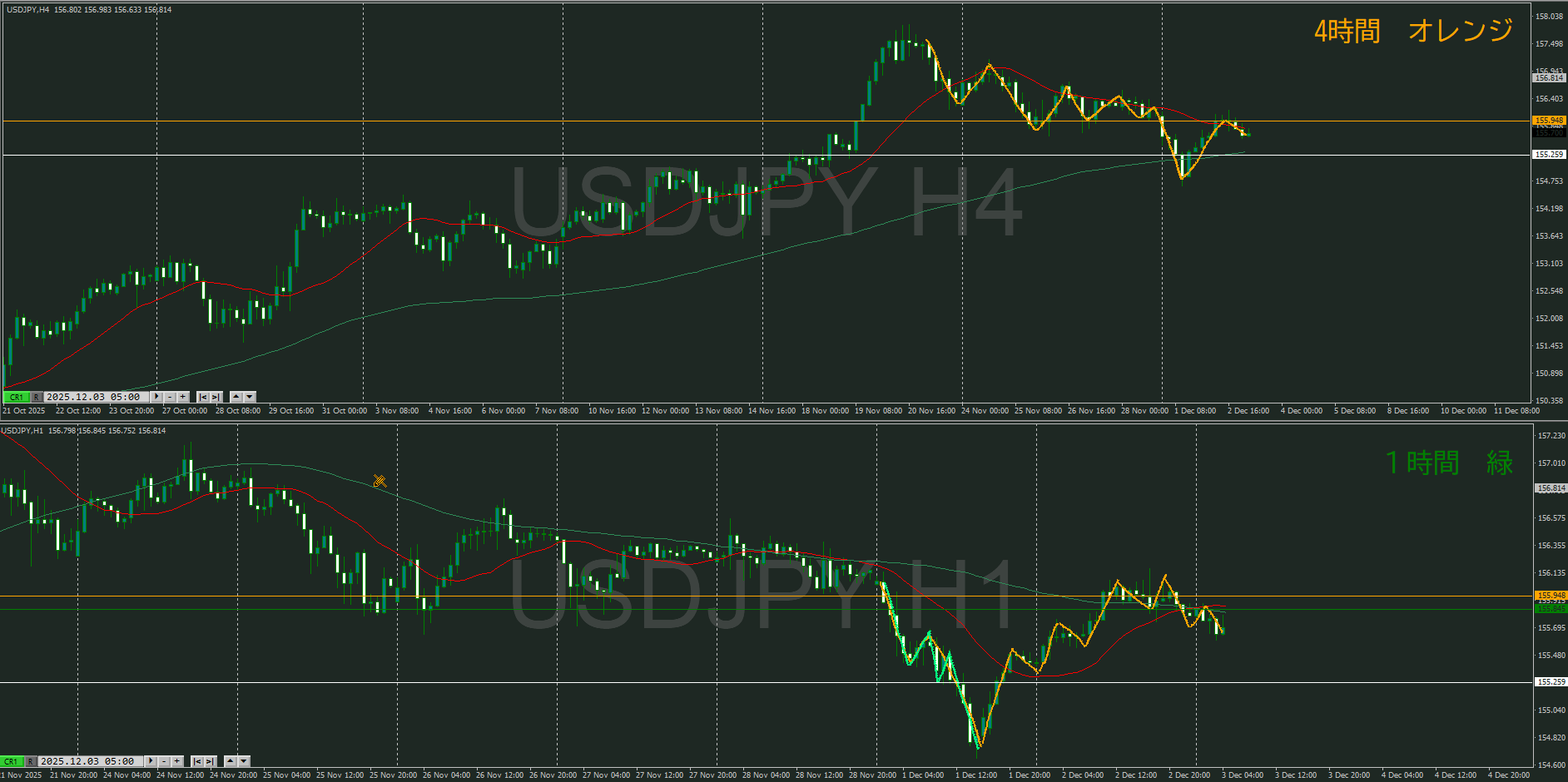 4時間 方向下 調整からトレンド転換シグナルが出たところ