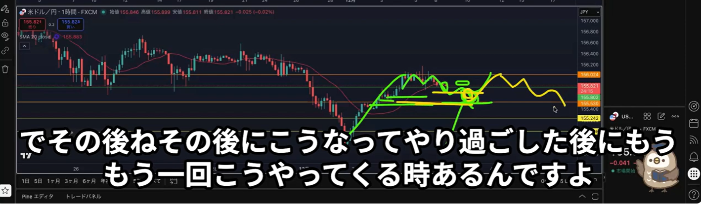 生のチャートではないので、ラインなどの複製が出来ず、この辺りかなと悩みながら他の時間軸にラインを引いてみた