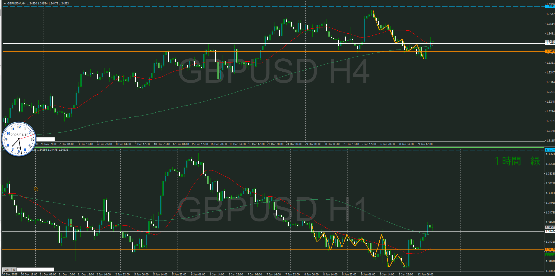 4時間のMAが下を向き始めてきたので、ロングを狙うなら1時間の上昇トレンド発生を待ちたい