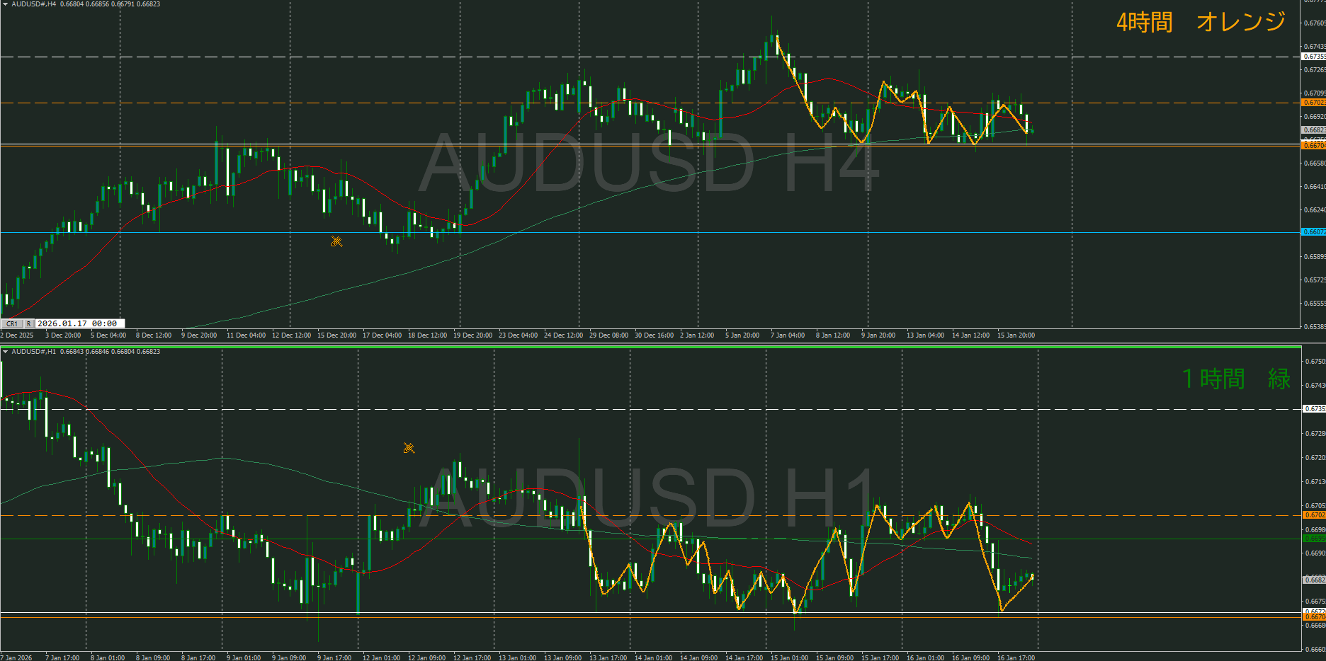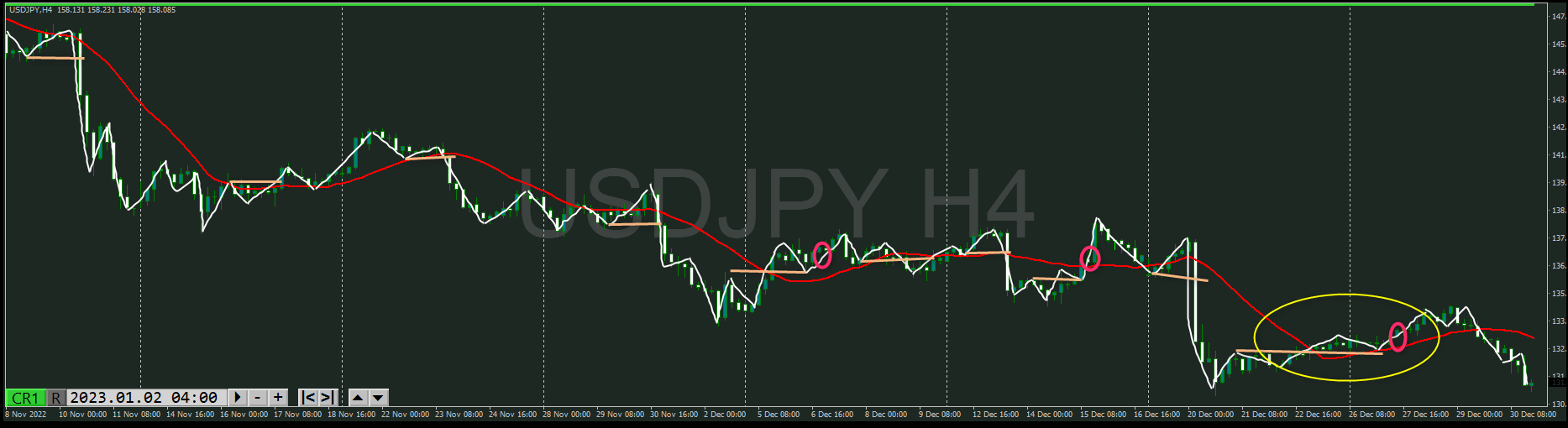 【4時間】方向下 戻り売りの波が安値付近に到達