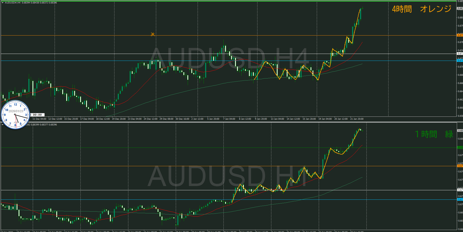 1時間で4時間の水平線で確認が取れるのを待つ