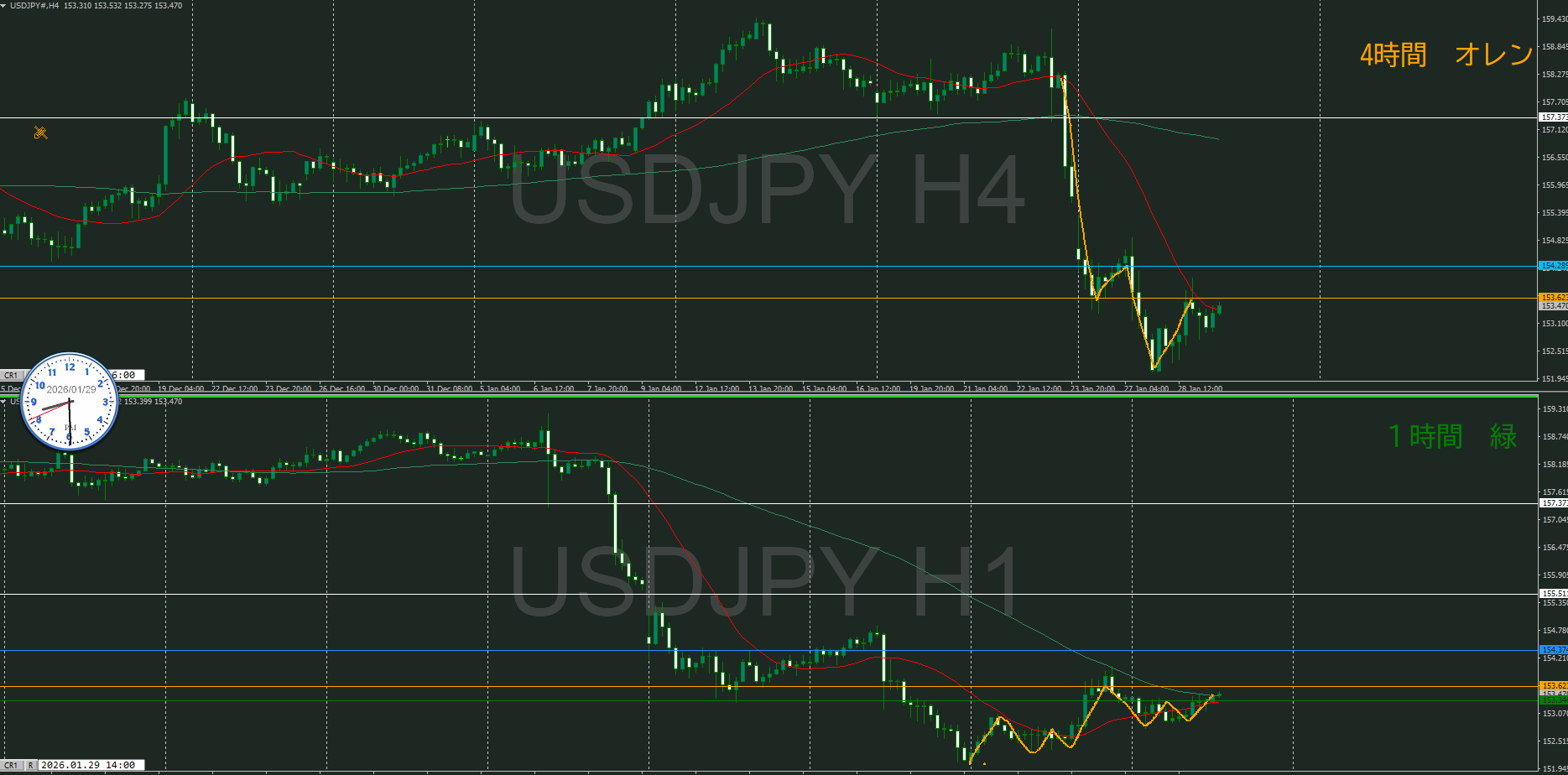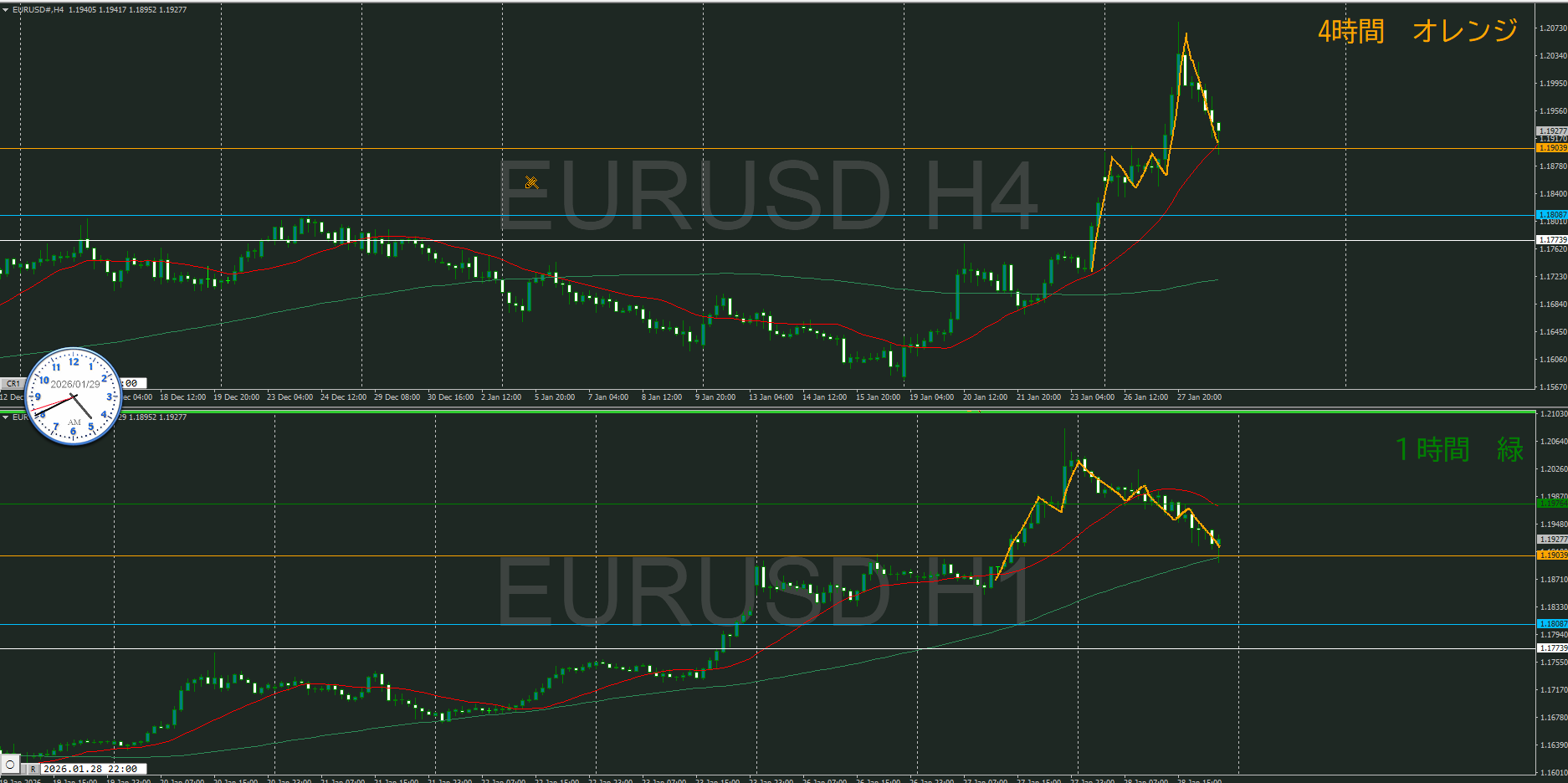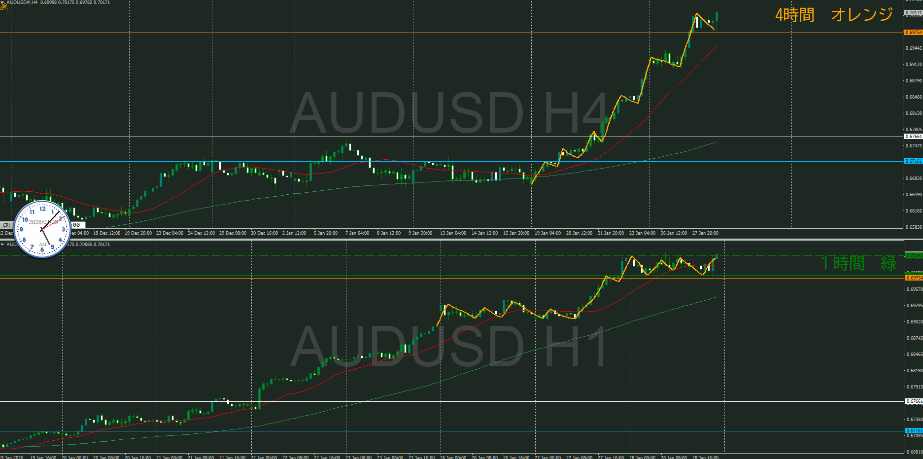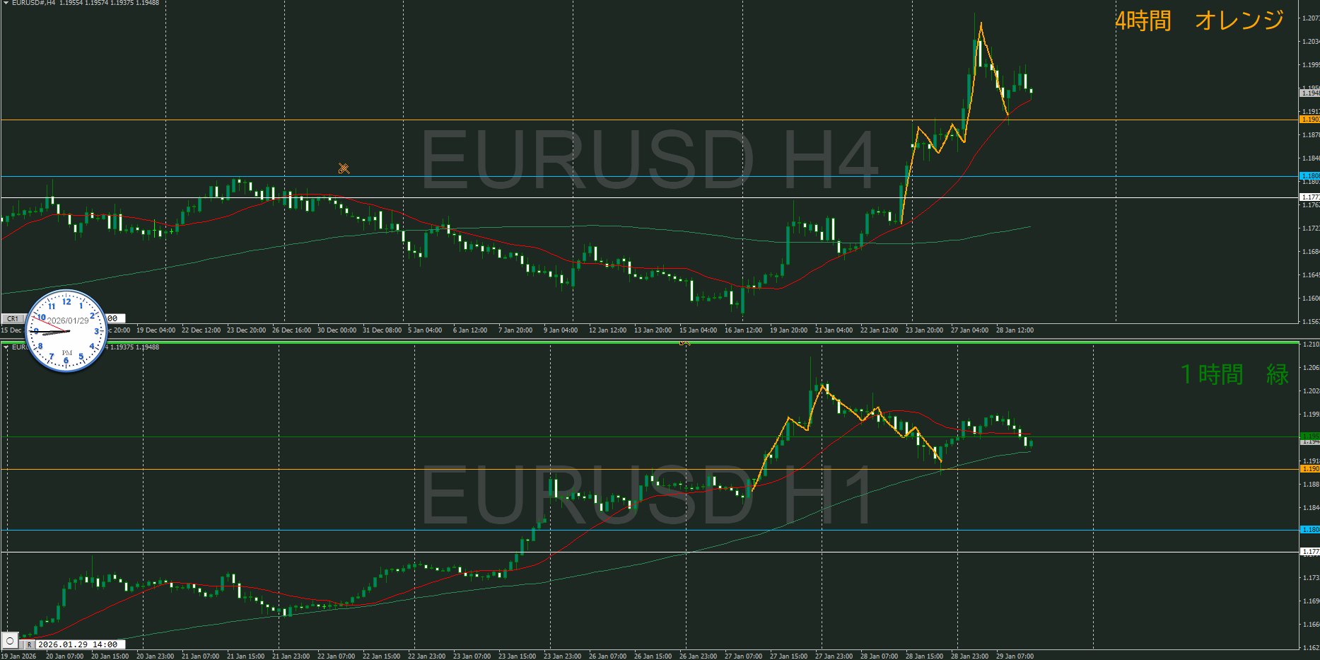 それで、その結果ですが、残念ながら4時間と1時間のMAが戦っている状況