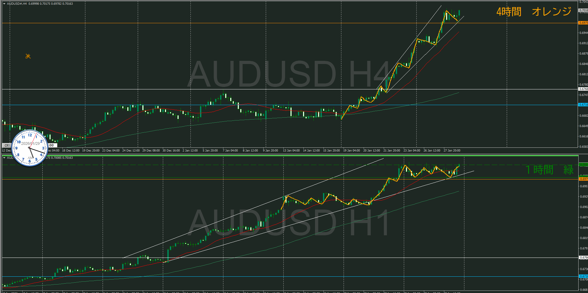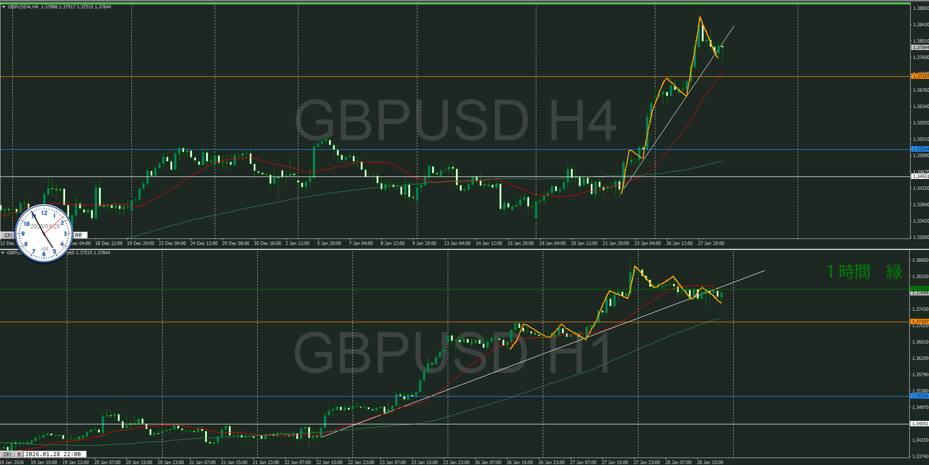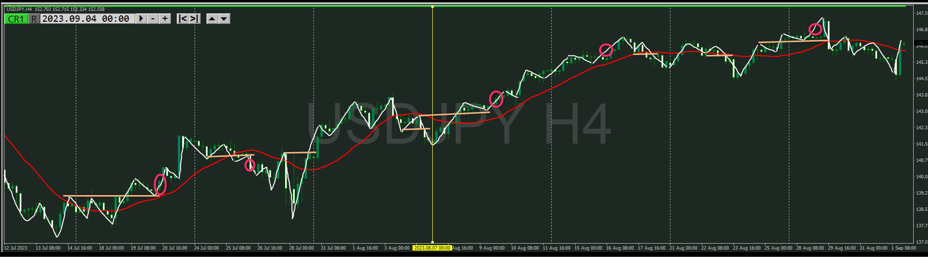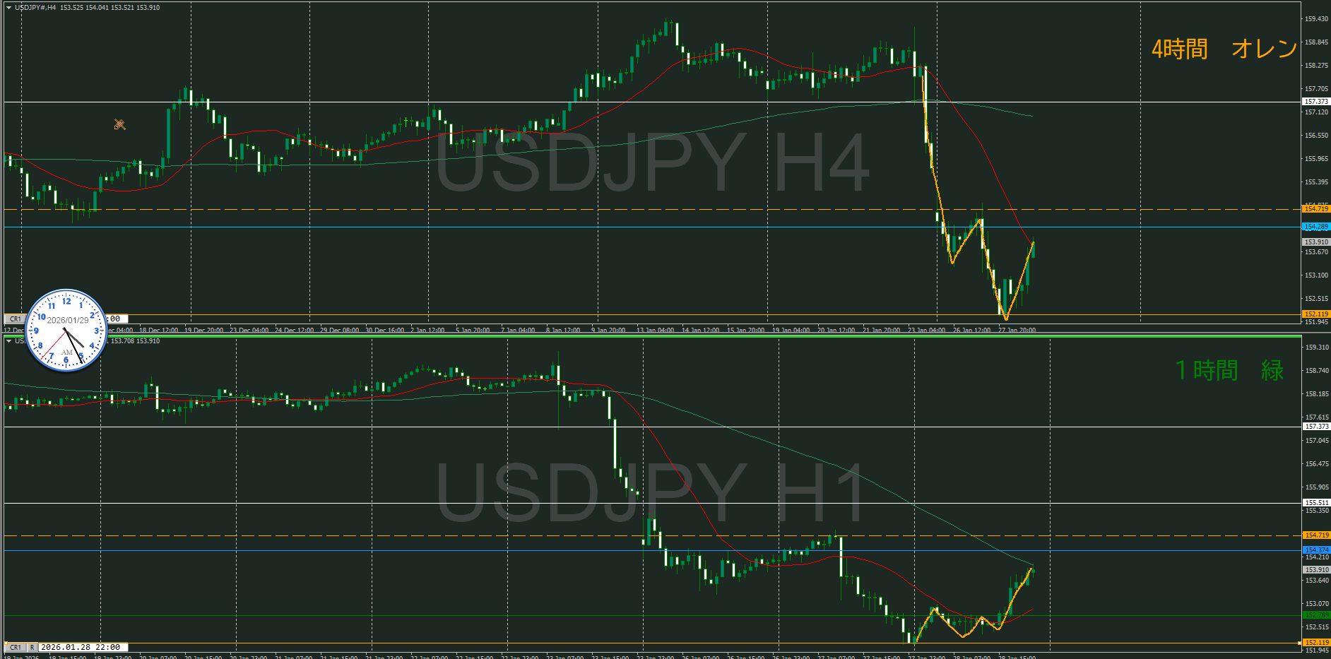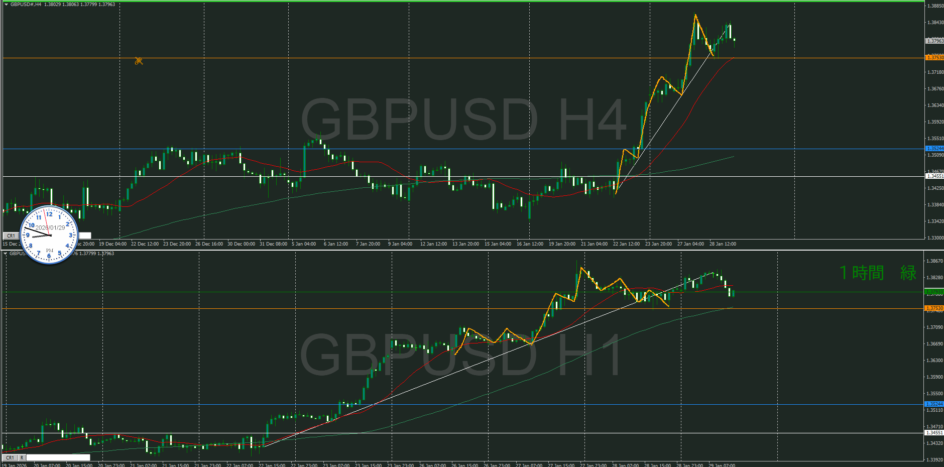 それで、その結果ですが、残念ながら4時間と1時間のMAが戦っている状況