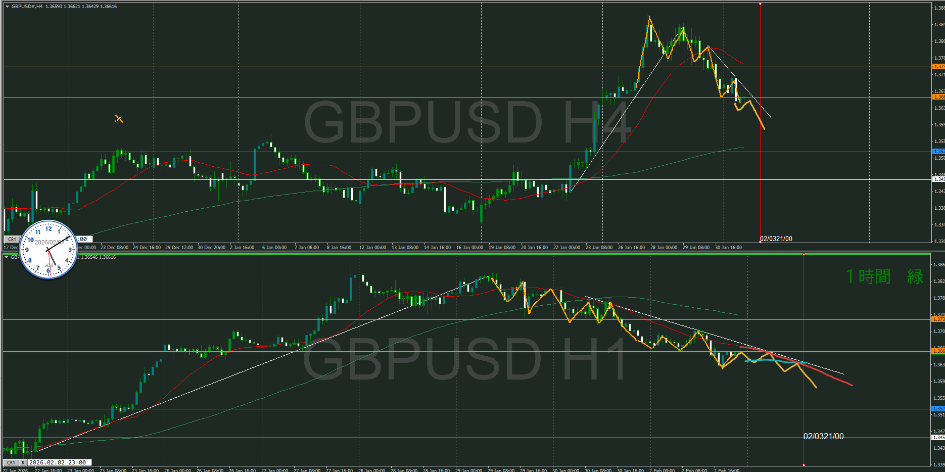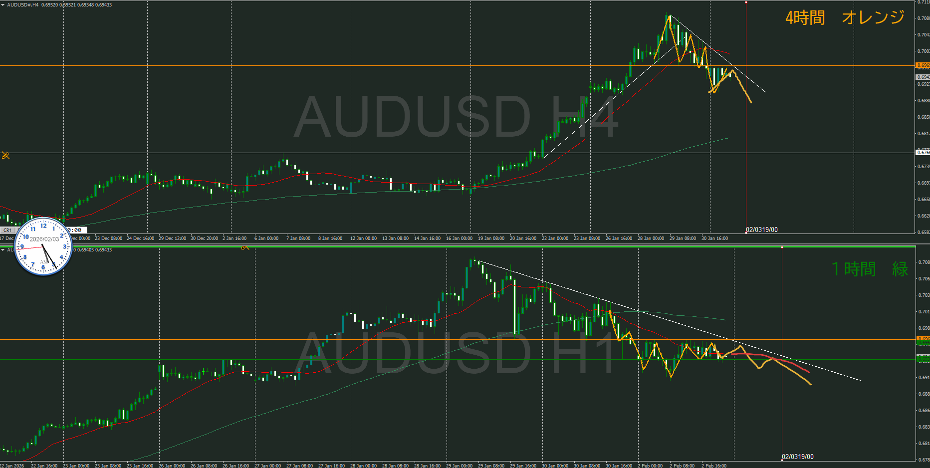 そうなると、4時間の斜めも考えると1時間のトレンド発生を待つぐらいか