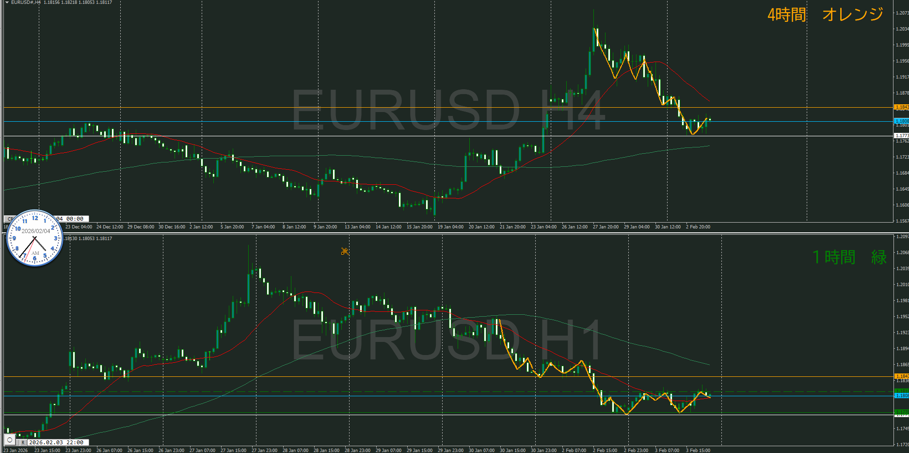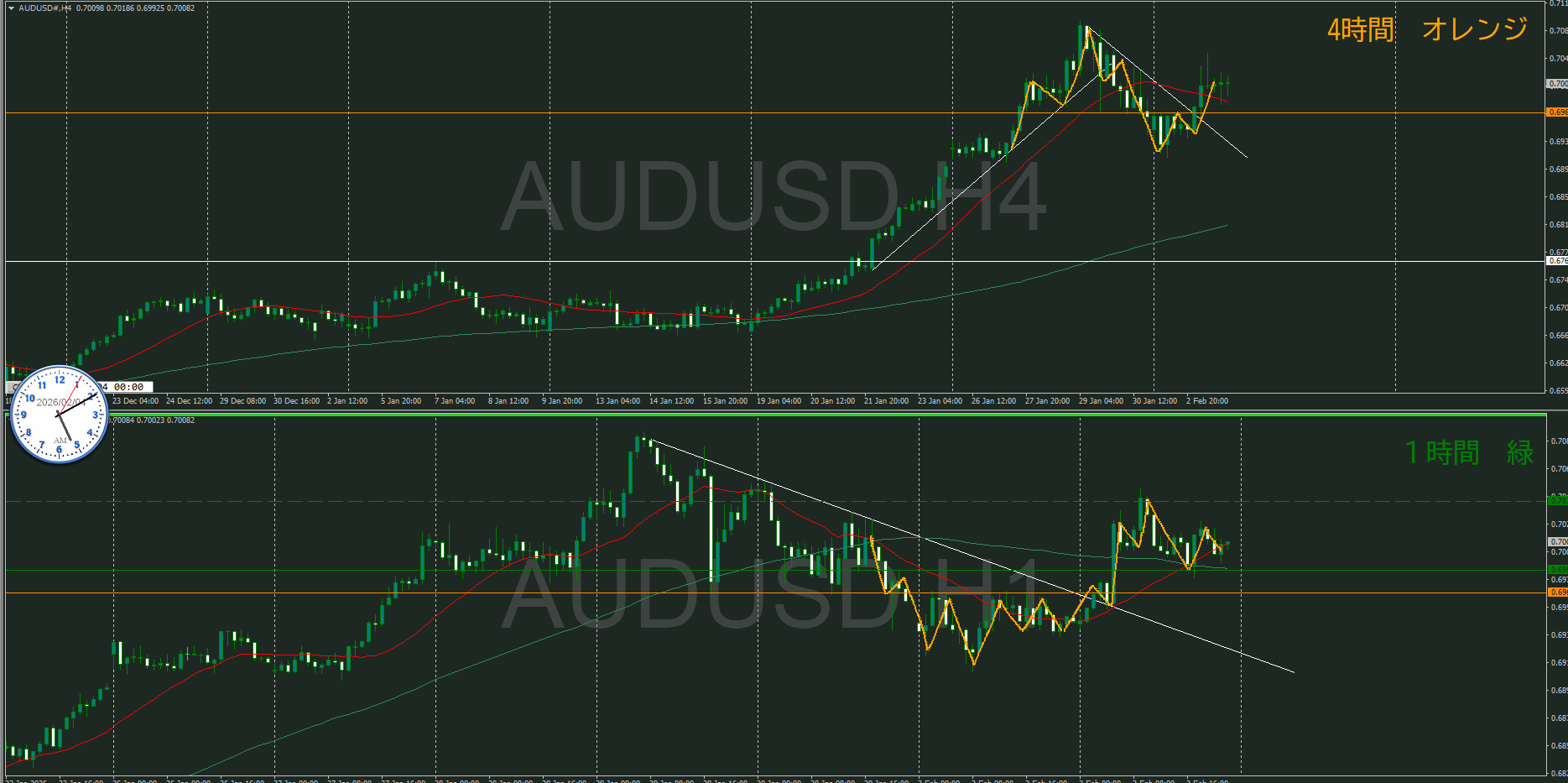 言葉的には「日足が押している波の途中で4時間の持ち合っているところ」