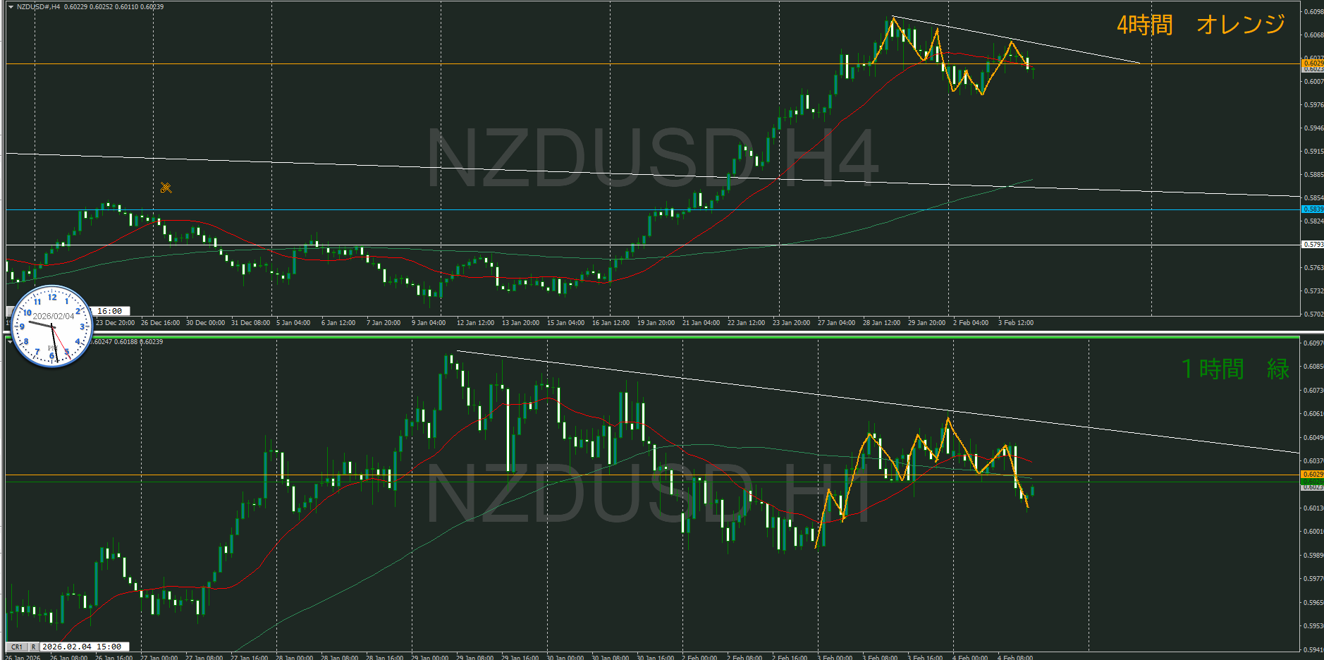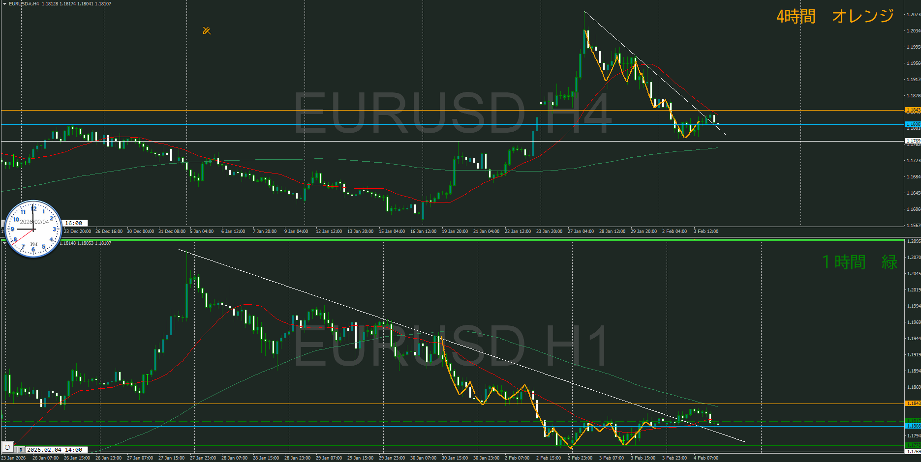 4時間の変則的な攻防ラインが見えるけど、ヒゲ先にも関わらずキレイに効いている