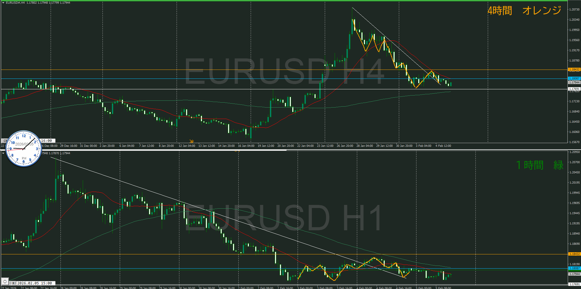 4時間下落の波の途中で1時間の下落トレンド発生を待って売りを検討できる