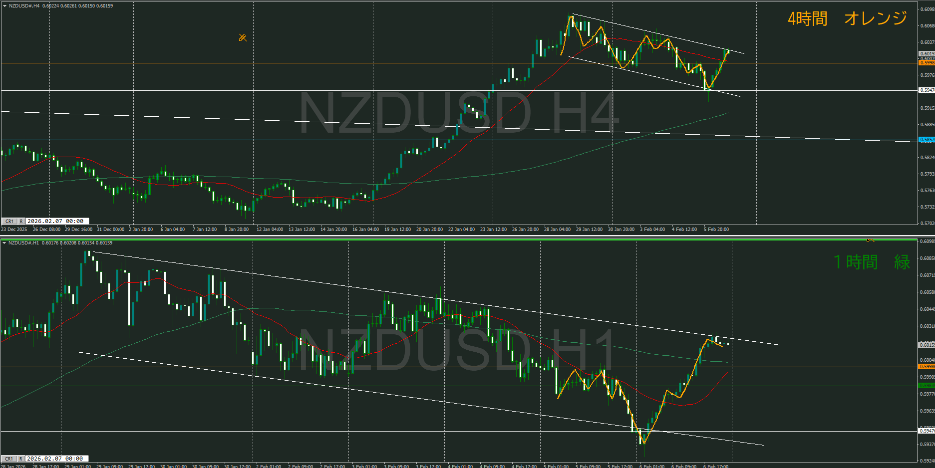 4時間では上昇トレンドが出る可能性があるが、下落チャネルラインが気になる