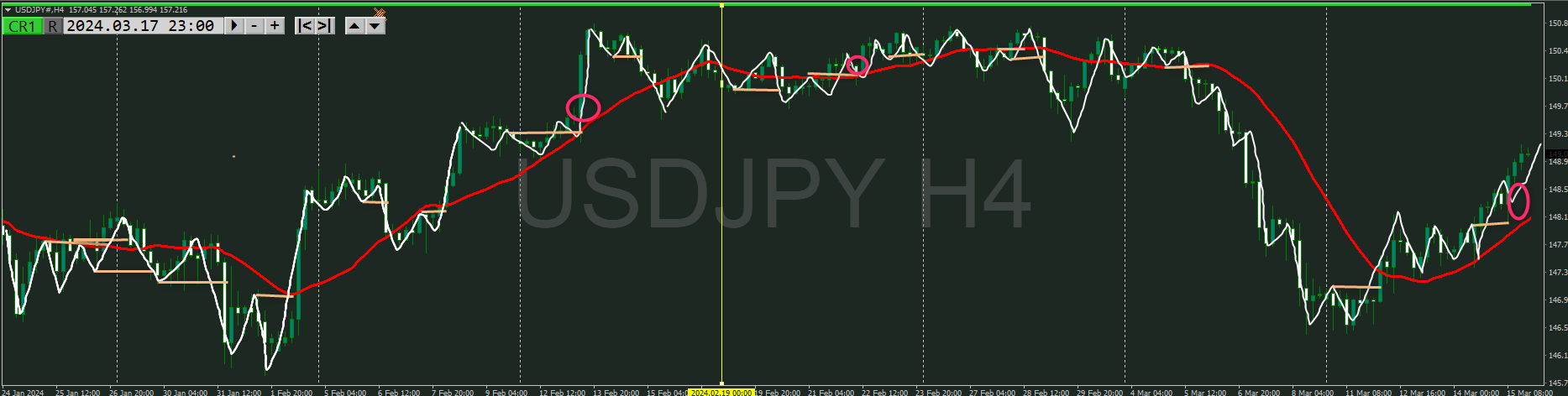 ただし、日足の上昇に対して半値勢力が現われる可能性もあるので、安易に売りとはならないので、売るなら4時間の下落トレンド発生を待ちたい
